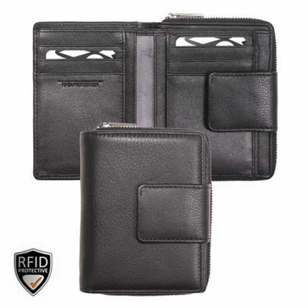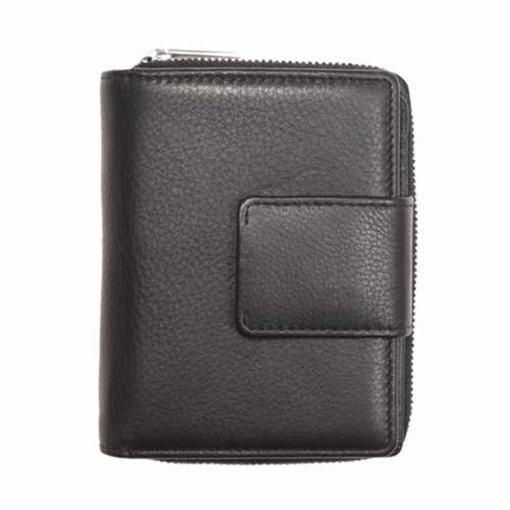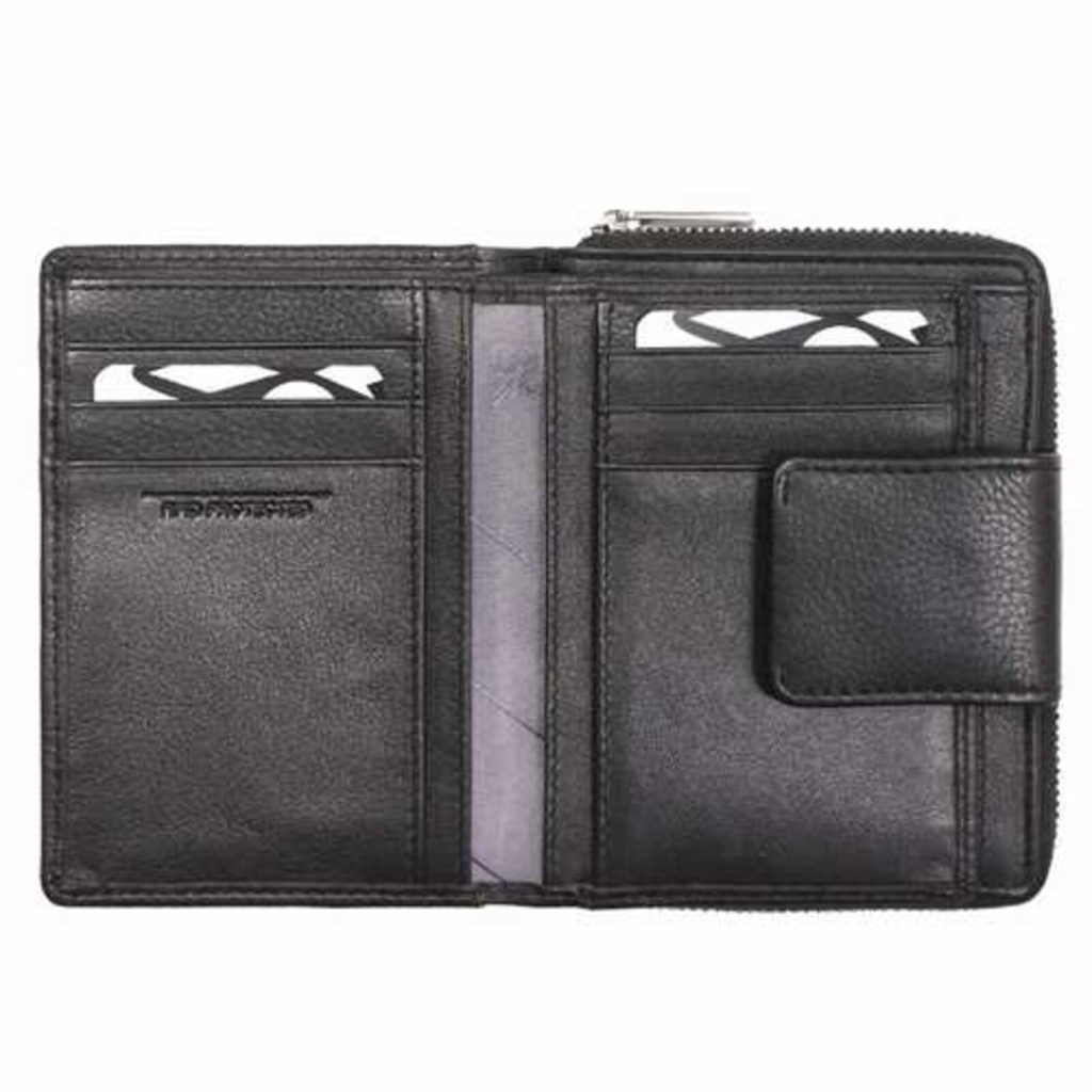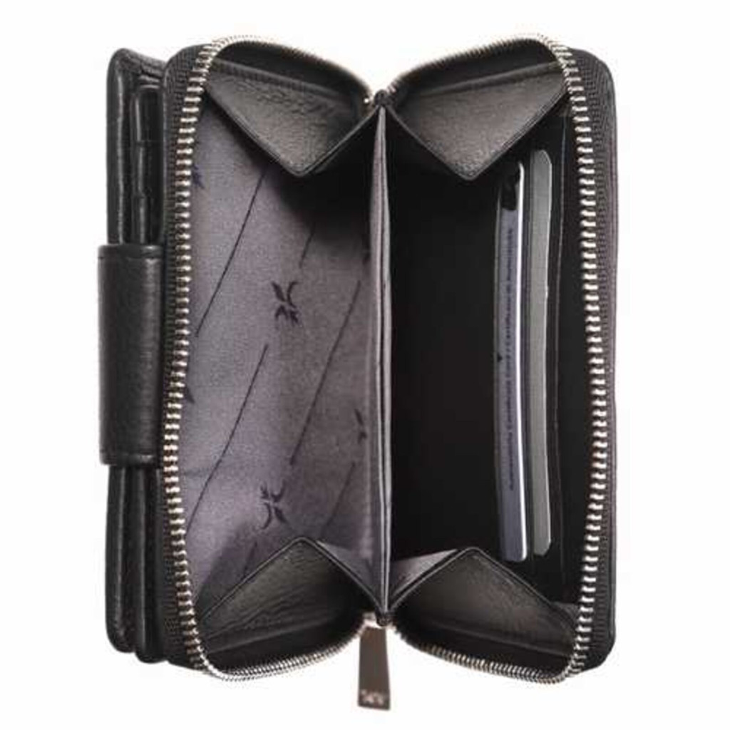 A nyomógombos biztonsági zár gondoskodik róla, hogy a pénztárca tartalma stabilan zárva maradjon.
