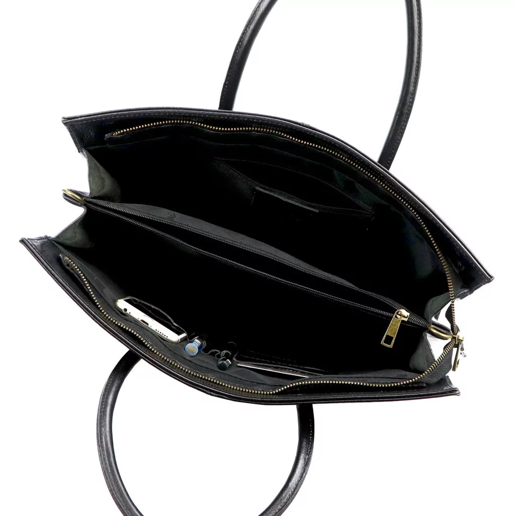 A Florence 1028 fekete női bőr aktatáska elegáns, üzleties megjelenésével és átgondolt belső kialakításával ideális választás munkához és hivatalos alkalmakhoz. Strukturált formája és arányos mérete professzionális megjelenést biztosít, miközben praktikus használatot kínál a mindennapok során.