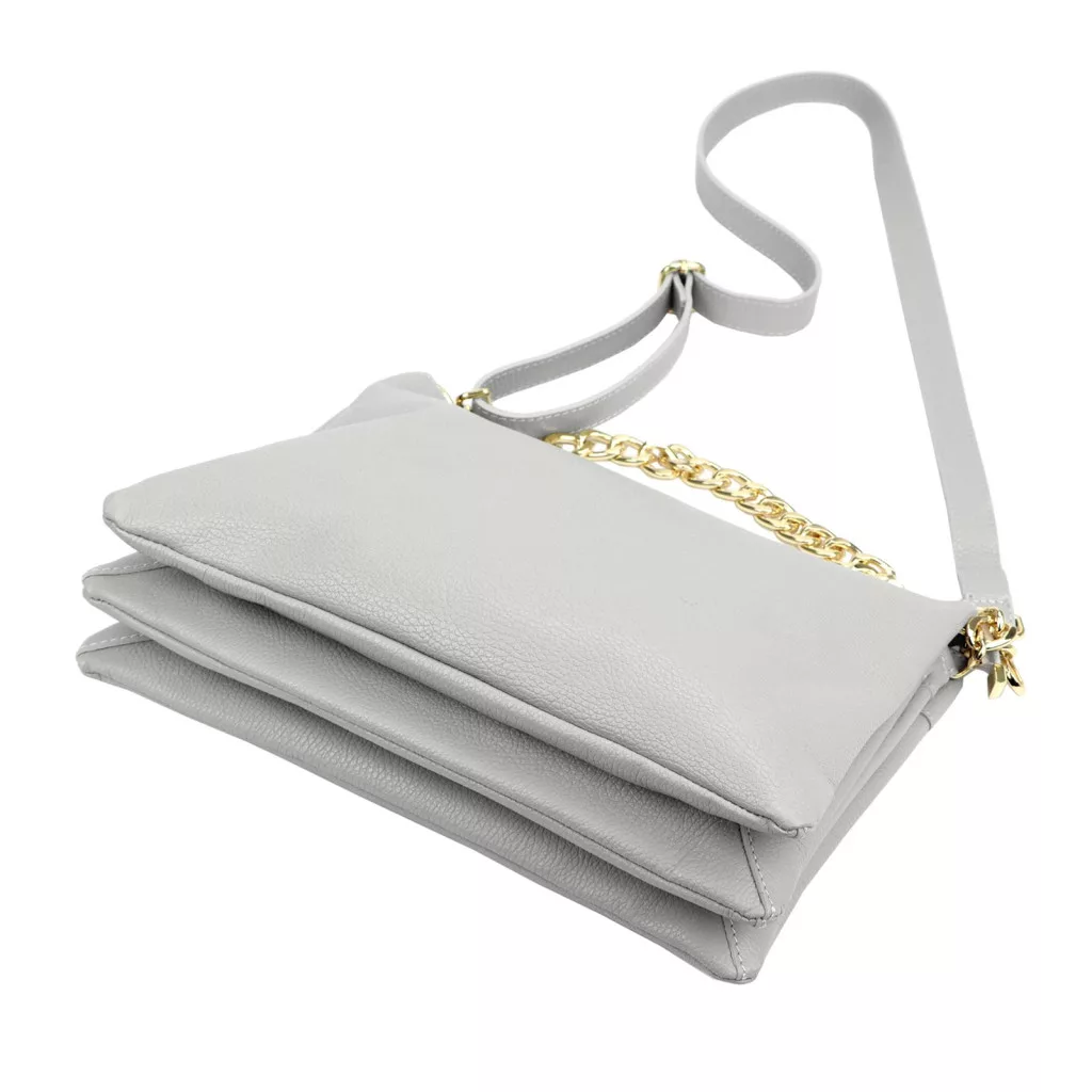 A táska levehető, állítható vállpánttal és kézi fogóval is rendelkezik, így többféle módon hordható. A láncos dísz modern, nőies megjelenést kölcsönöz, míg a szürke szín könnyedén kombinálható világos és sötétebb tónusokkal is.