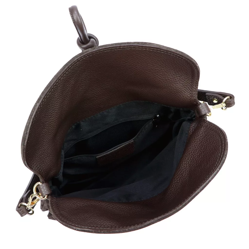 A Luka 25-002 sötétbarna női velúr bőr válltáska prémium olasz velúr bőrből készült, amely bársonyos textúrájával és gazdag, mélybarna árnyalatával elegáns és kifinomult kiegészítő. A sötétbarna szín klasszikus, időtálló és sokoldalú, amely könnyedén illeszkedik mindennapi viselethez és különleges alkalmakhoz is.