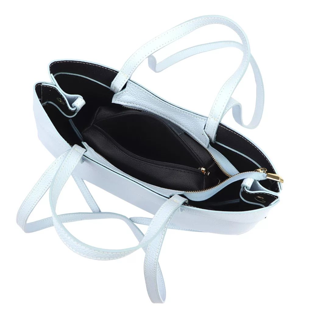 A táska prémium minőségű marhabőrből készült, DOLLARO típusú, finoman szemcsézett felülettel. Ez a bőrtípus tartós, ellenálló és elegáns textúrát ad a táskának. A pasztell kék szín a feng shui szerint a nyugalom, a tisztaság és a harmónia jelképe. Világos, lágy árnyalata friss és elegáns karaktert kölcsönöz a táskának.