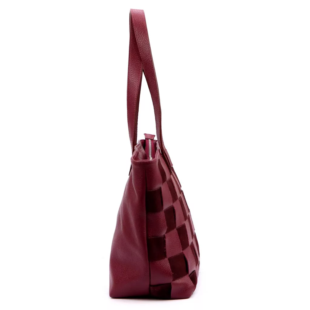 Luka 25-080 női válltáska a modern elegancia és a kézműves jellegű textúrák különleges találkozása. Prémium minőségű, valódi marhabőrből és finom velúr bőrből készült, melyek kifinomult fonott hatású mintázatot alkotnak. A bordó árnyalat mély, gazdag tónusa romantikus, nőies karaktert kölcsönöz a táskának, és elegánsan kiemeli a velúr és szemcsés bőr természetes textúráját.