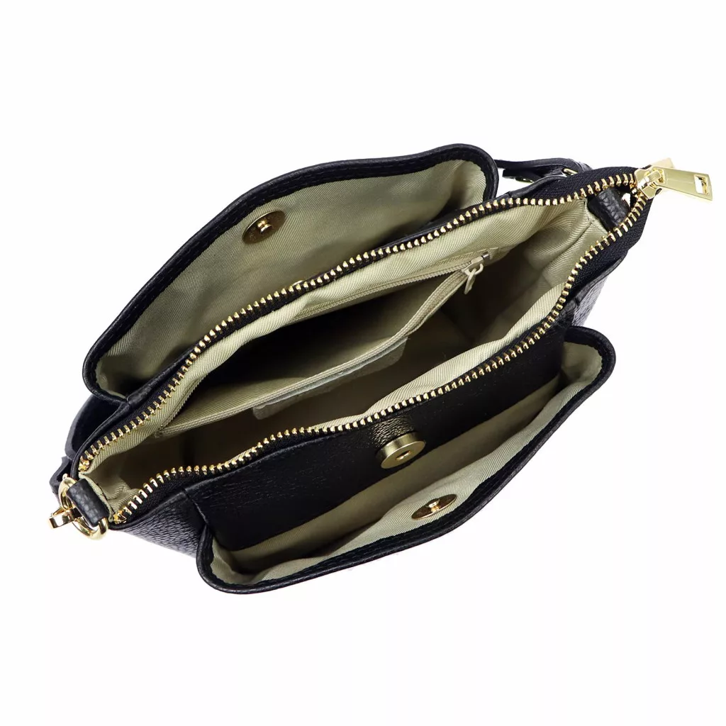 A háromrekeszes kialakítás praktikus rendszerezést biztosít. A középső cipzáras rekesz biztonságosan tárolja az értékeket, míg a két patentos rekesz gyors hozzáférést tesz lehetővé a gyakran használt tárgyakhoz. A belső cipzáras zseb további rendszerezési lehetőséget kínál.