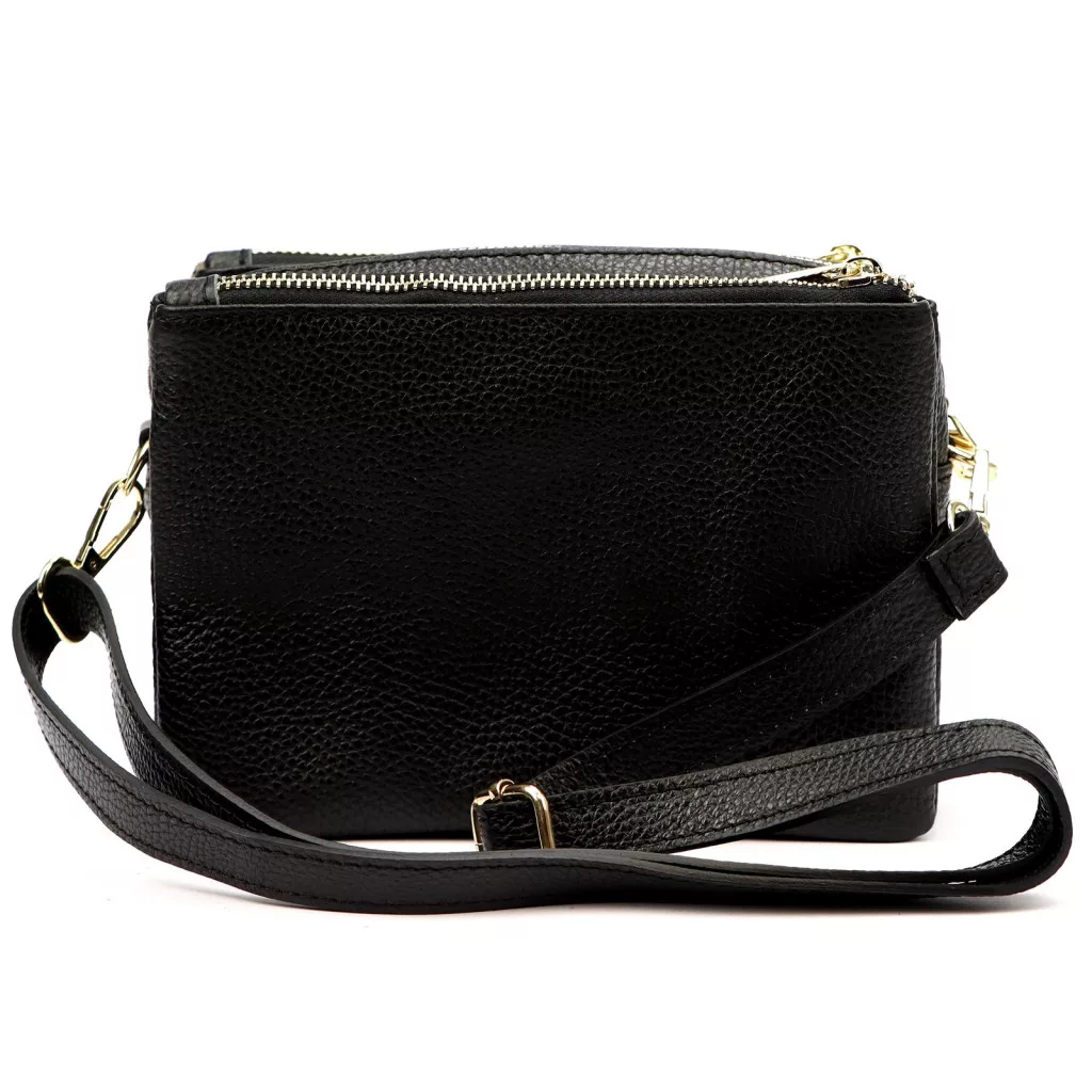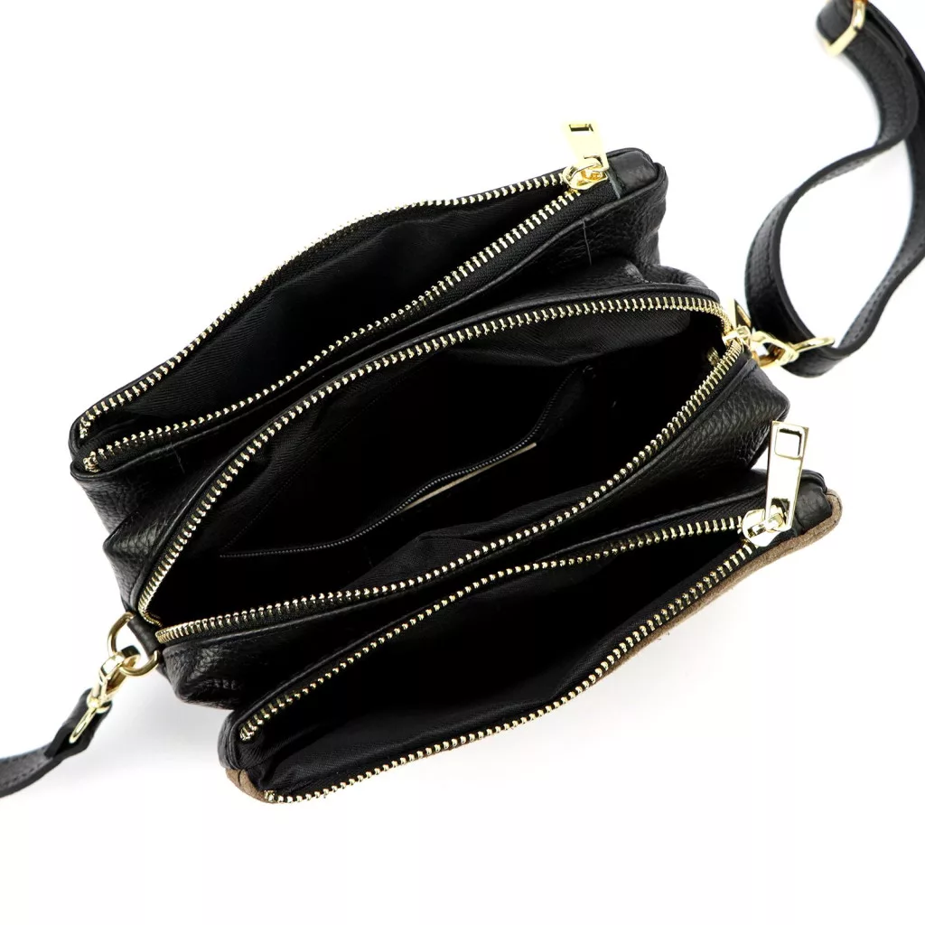 A táska háromrekeszes kialakítása átlátható elrendezést biztosít, így ideális mindennapi használatra. A fő cipzáras rekeszek mellett egy belső cipzáras mobiltartó zseb is található, amely biztonságos tárolást nyújt a kisebb értékeknek. Az aranyszínű fémkiegészítők finoman emelik ki a táska klasszikus eleganciáját.