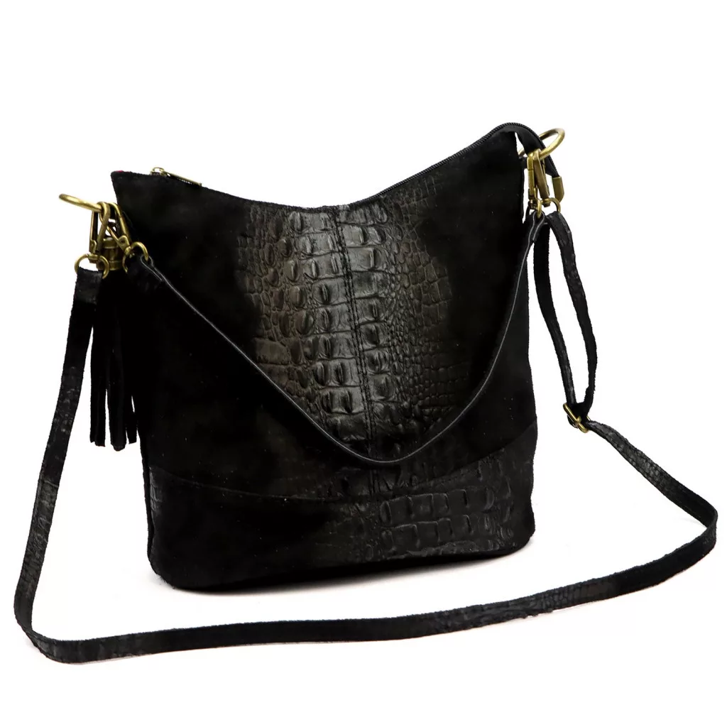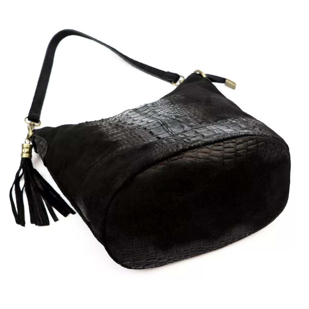A táska középső részén a krokodilmintás bőr strukturált, enyhén domború mintázata kontrasztban áll a velúros oldalfelületekkel, ami különleges, modern megjelenést biztosít. Az oldalán díszes bőr bojt és antikolt sárgaréz fémrészletek teszik teljessé a luxus hatást.