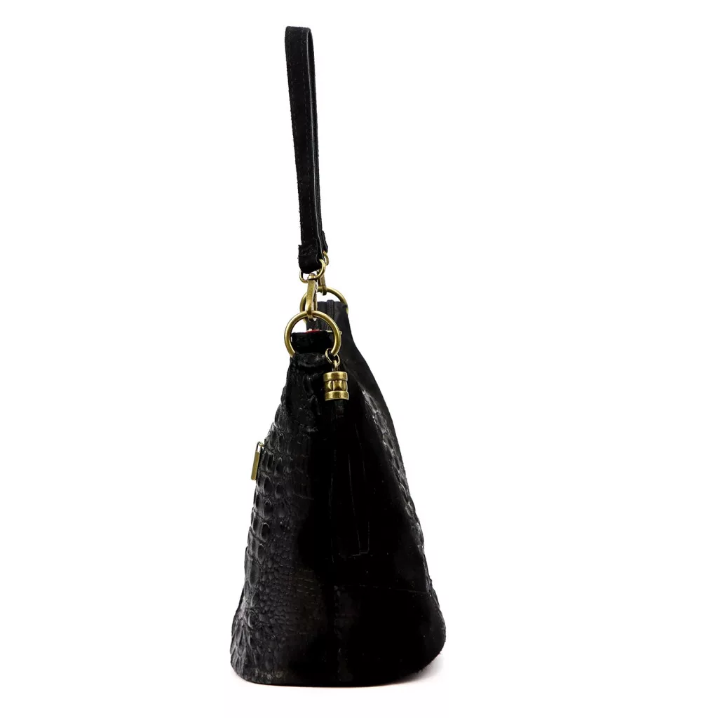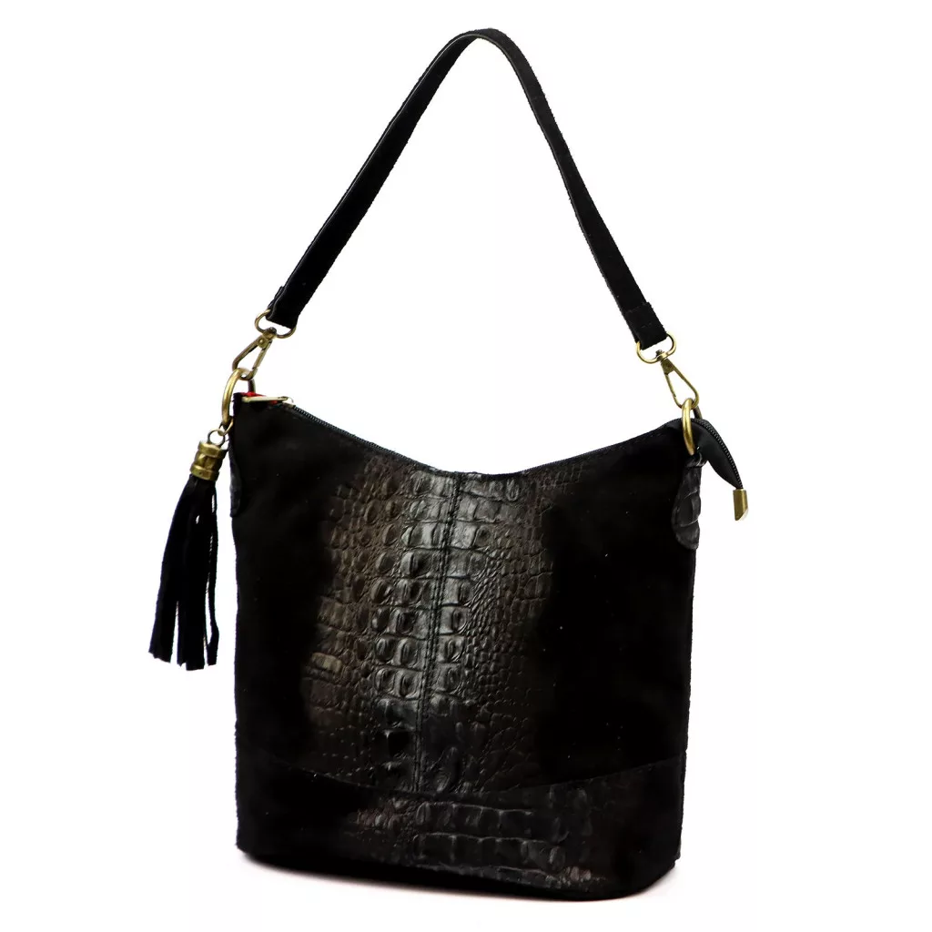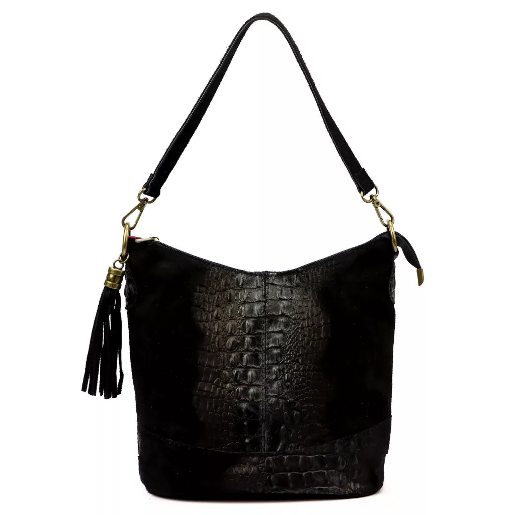 A Luka 26-027 CROCO válltáska a klasszikus elegancia és a modern, karakteres stílus tökéletes egyensúlyát képviseli. Egyedi megjelenését a krokodilmintás, enyhén fényes marhabőr és a puha, matt velúr bőr kombinációja adja, amely különleges textúrajátékot hoz létre. A felületen finom színátmenet figyelhető meg: a mélyfekete árnyalat a fény hatására grafitszürke tónusban játszik, elegáns és prémium összhatást keltve.