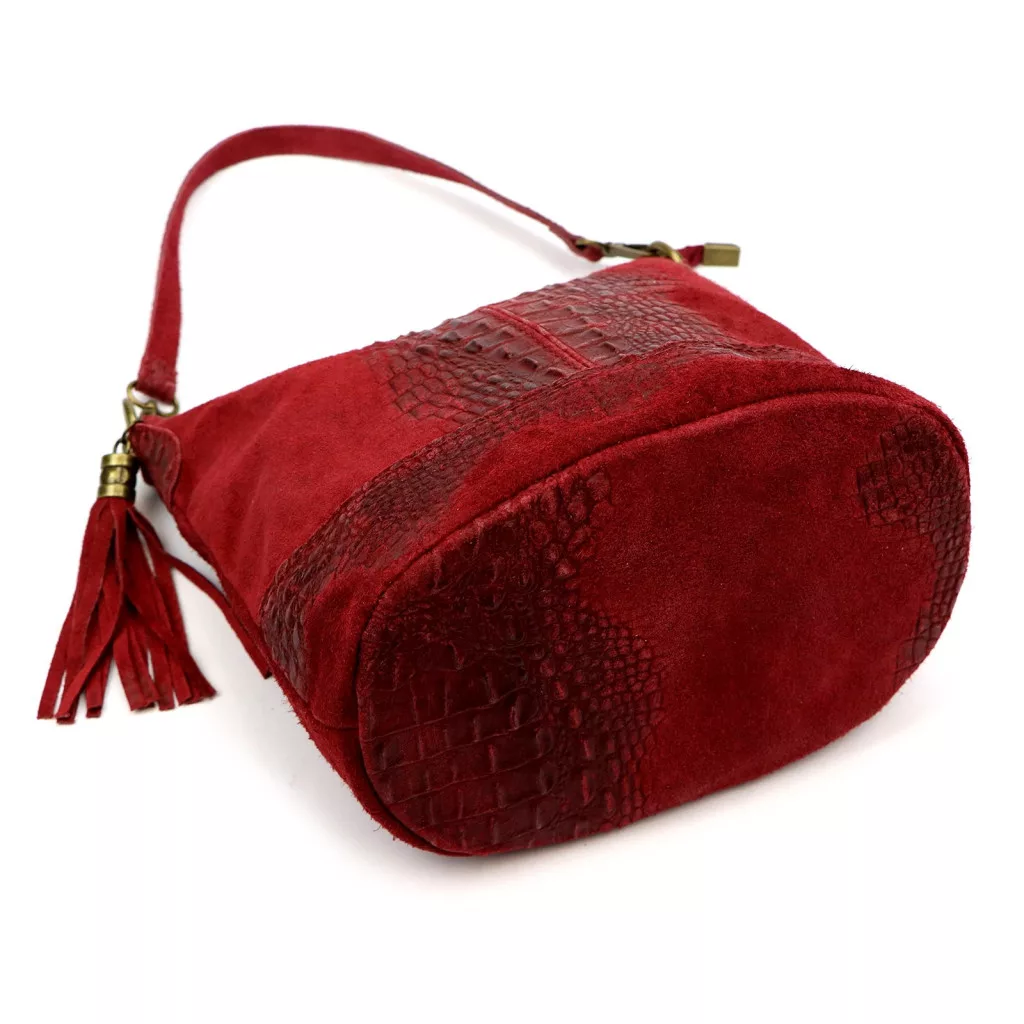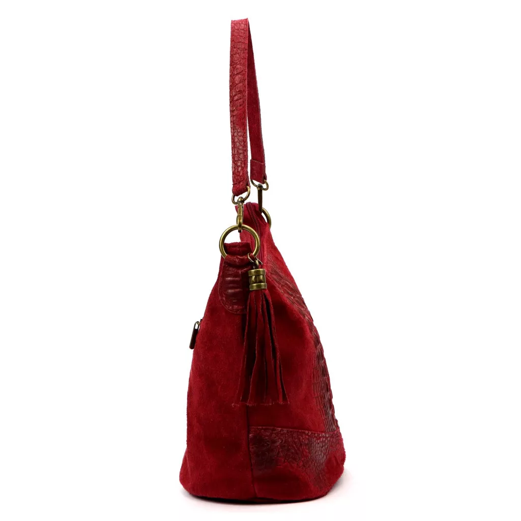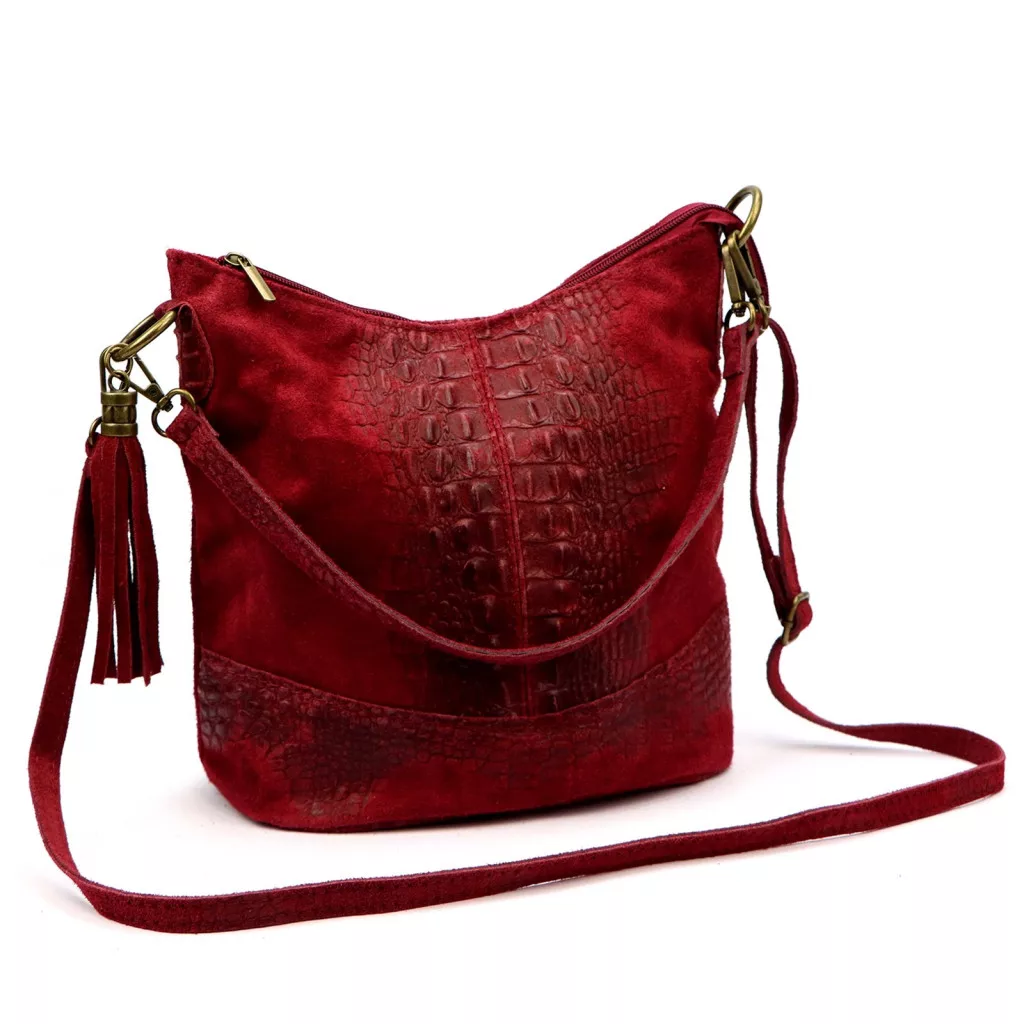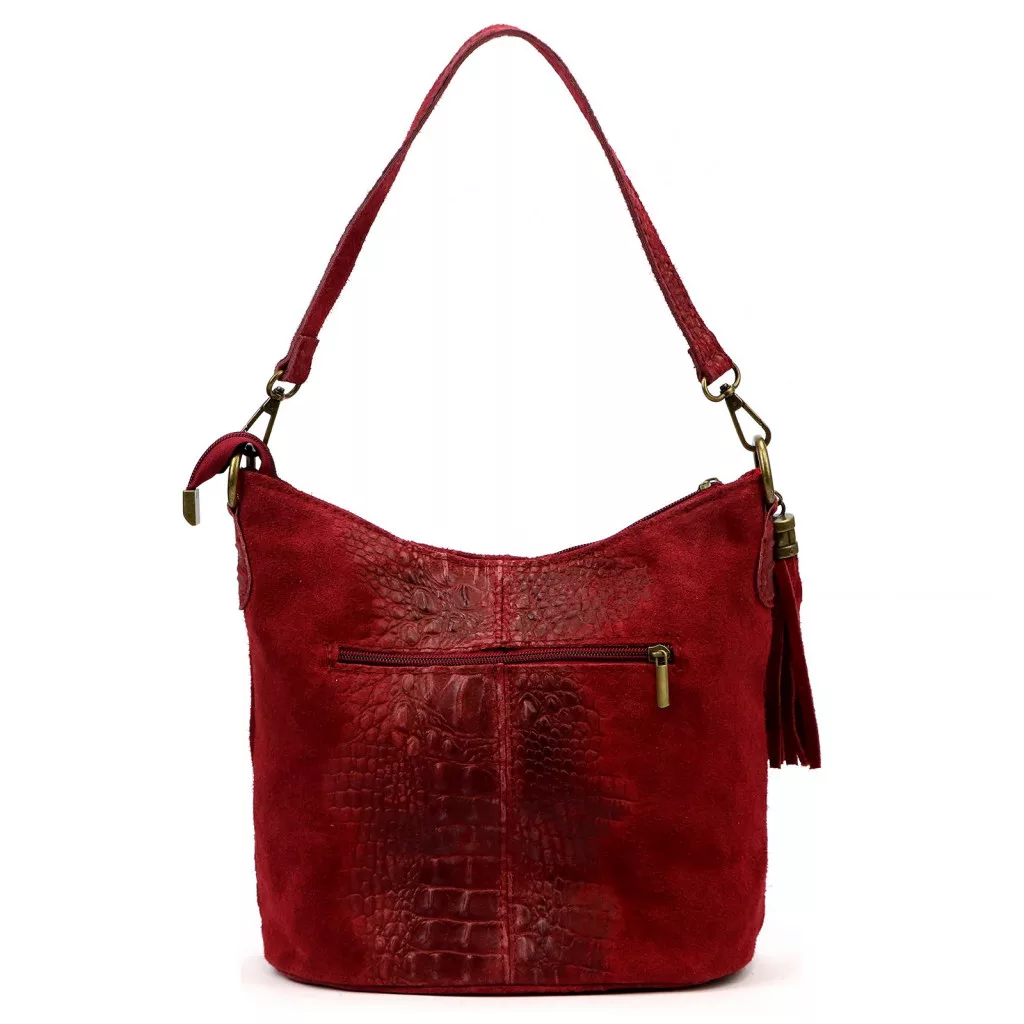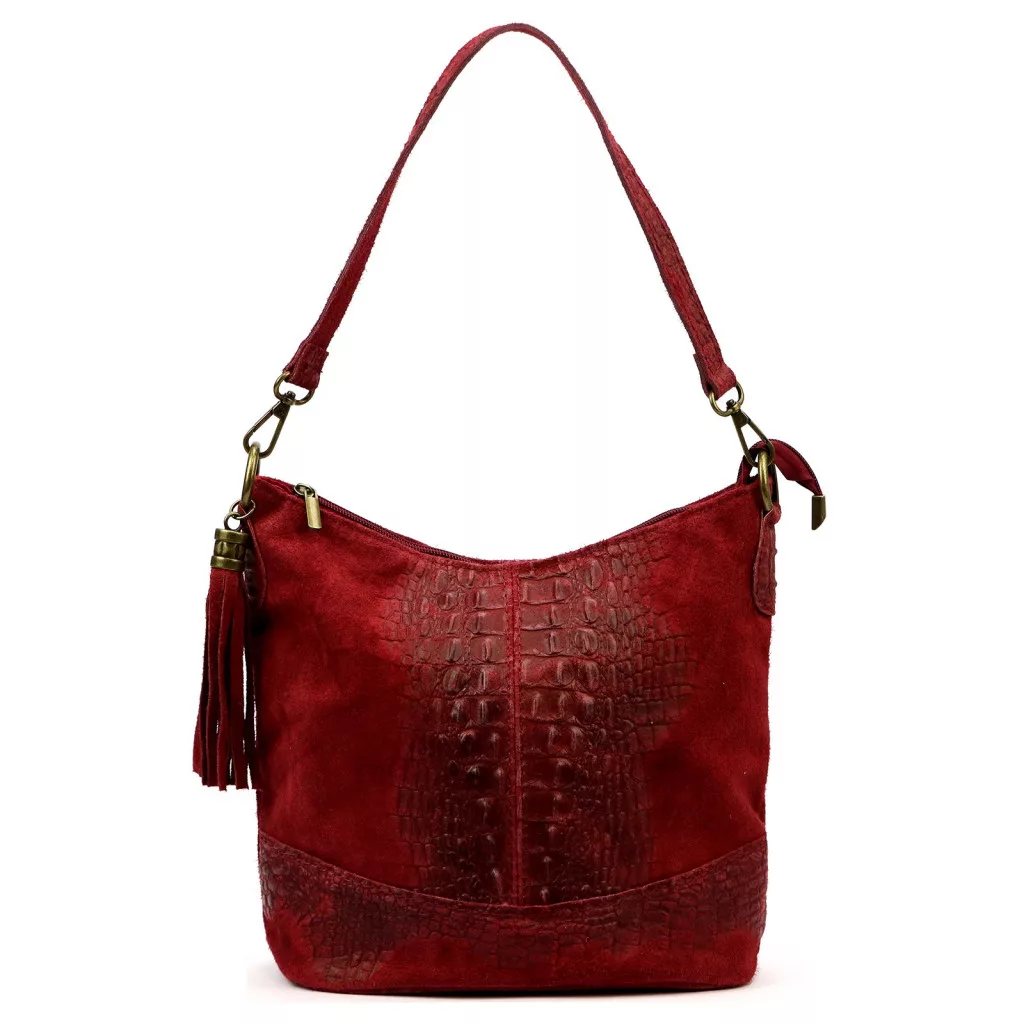 A Luka 26-027 CROCO válltáska a nőies elegancia és a modern luxus különleges ötvözete. Prémium minőségű, krokodilmintás marhabőrből és puha velúr bőrből készült, amelyek együtt gazdag textúrájú, mégis harmonikus megjelenést alkotnak. A táska felületén lágy színátmenet figyelhető meg: a mélybordó árnyalat a fényben vöröses-boros tónusban játszik, ezzel mélységet és karaktert adva a bőr felületének.