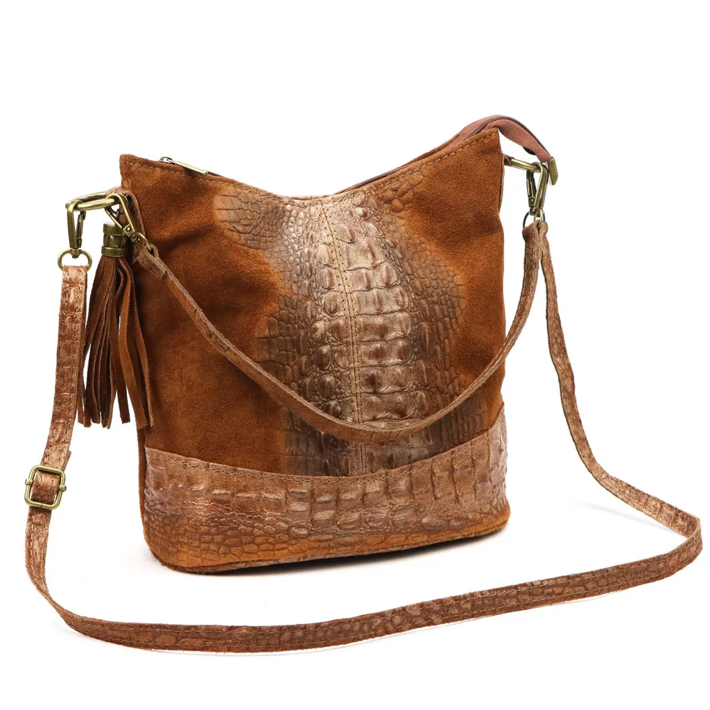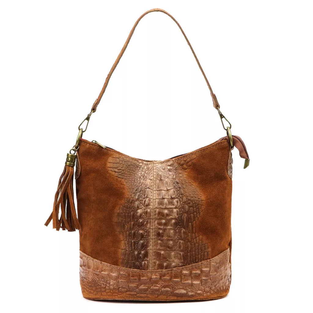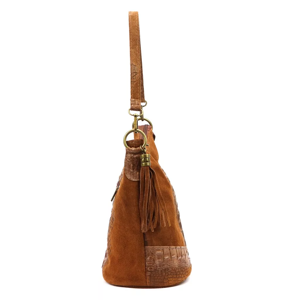 A táska prémium minőségű valódi bőrből készült, amely különleges textúráival emelkedik ki. A krokodilmintás középső panel enyhén domború hatású, elegáns fókuszpontot teremtve, míg a matt velúr oldalak finom kontrasztot adnak a megjelenésnek. Az anyagok találkozása exkluzív és stílusos összhatást biztosít.