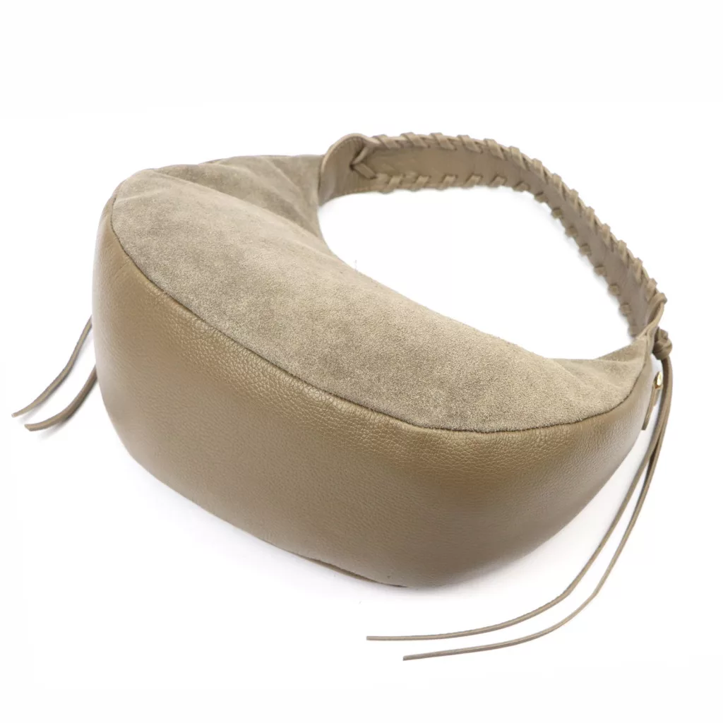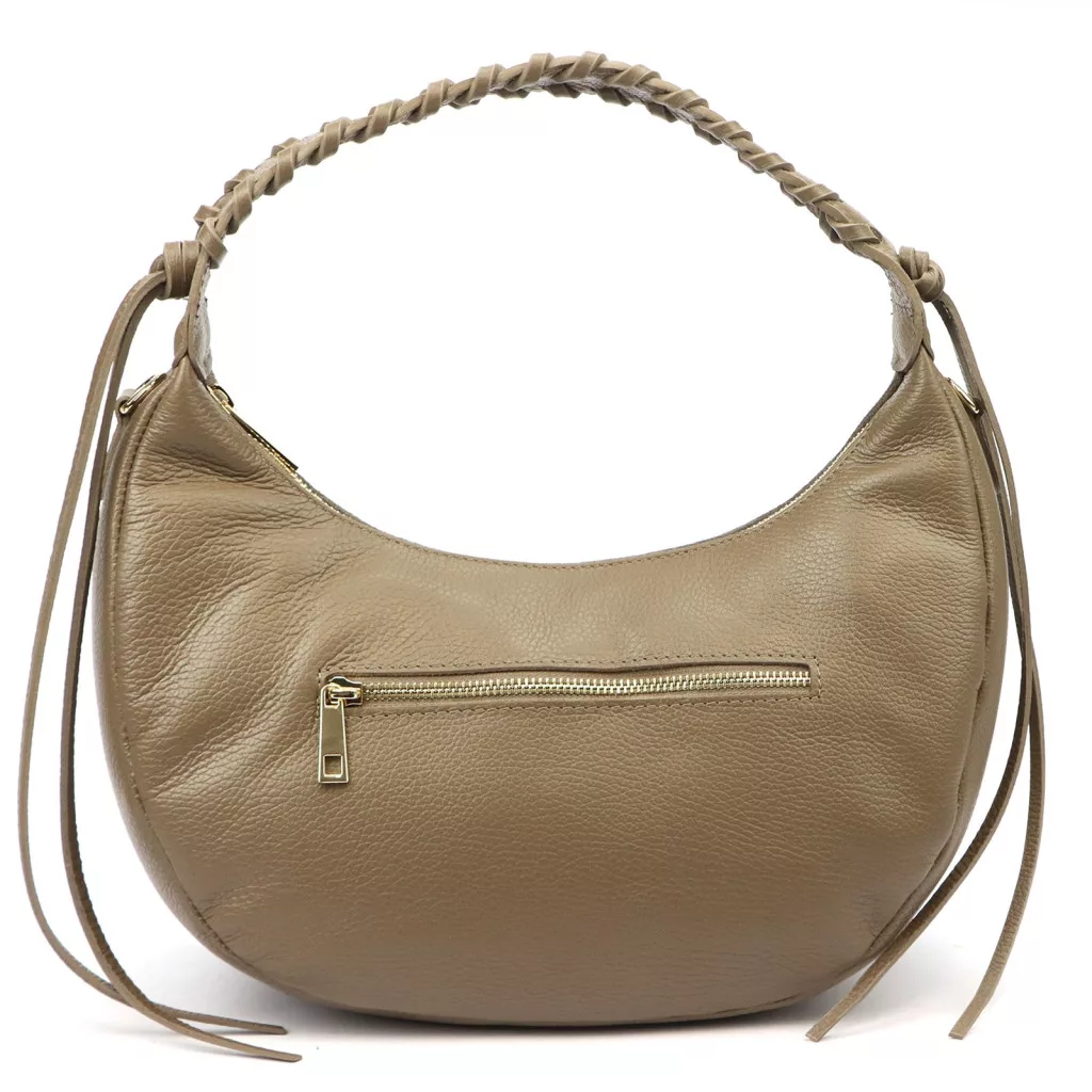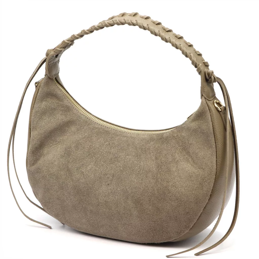 A Luka 26-039 taupe válltáska modern, nőies és karakteres darab, amely a félhold (half moon) táskák elegáns íveit ötvözi a velúr bőr természetes puhaságával. A bársonyos tapintású taupe velúr kifinomult, visszafogott tónust biztosít, amely könnyedén illeszkedik a szezon aktuális földszínű trendjeihez. A fonott, vastag válltáskapánt különleges, egyedi részlet, amely egyszerre stíluselem és kényelmes viseleti megoldás. A táska harmonikus, lágy ívű formája nőies és modern megjelenést kölcsönöz, miközben a jól strukturált kialakítás a mindennapokban is praktikus társsá teszi.