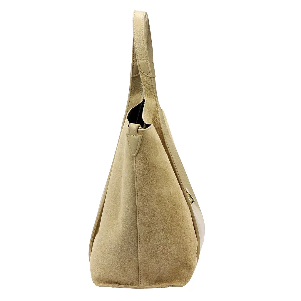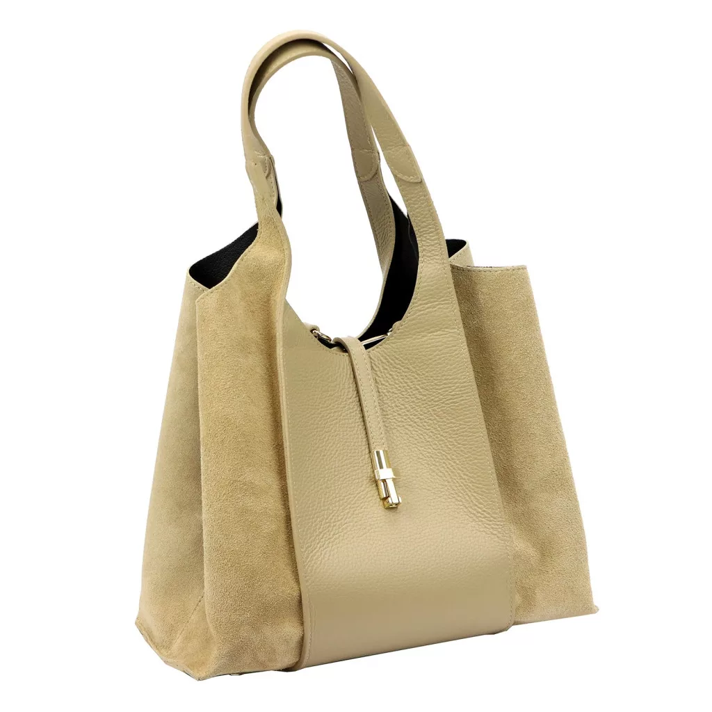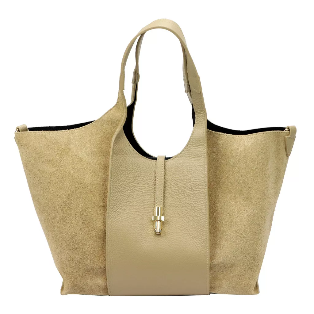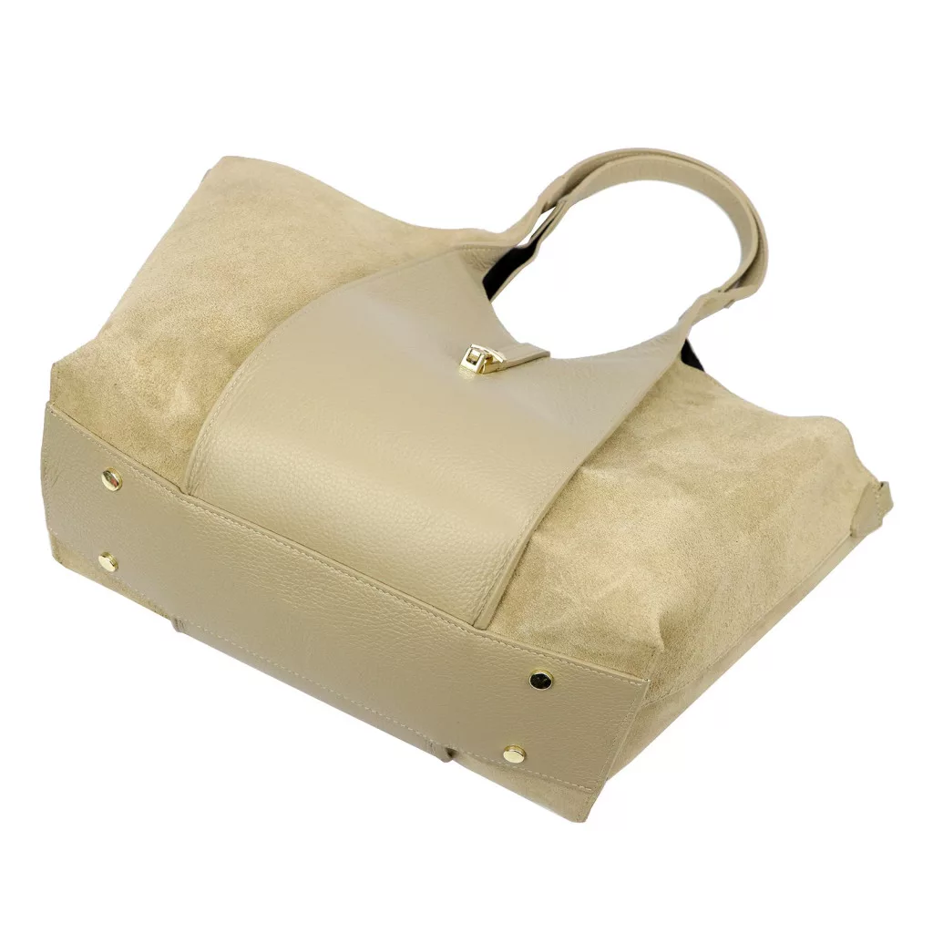 Elegáns, városi és nőies megjelenés. A velúr bőr finom textúrája, a bézs árnyalat és a tágas kialakítás harmonikus, modern táskát eredményez, amely jól illeszkedik a mindennapi öltözködéshez.