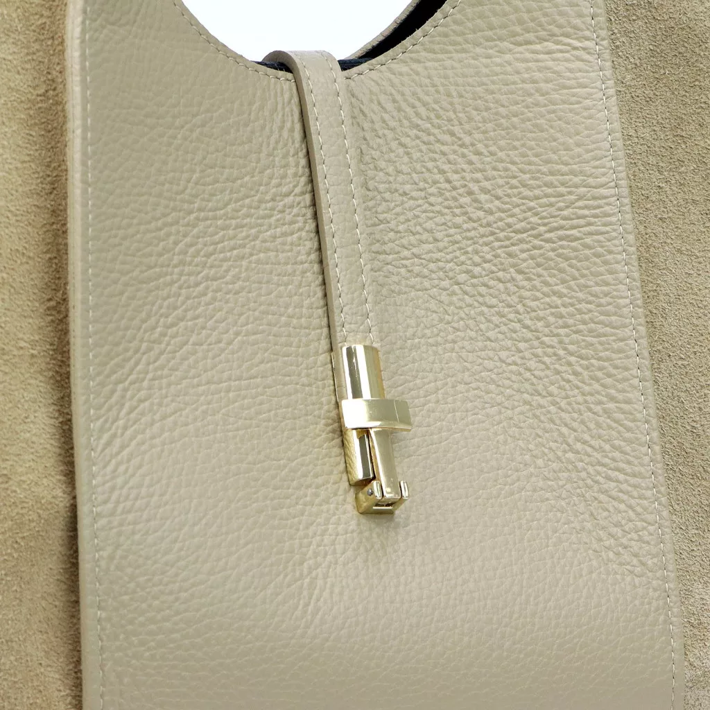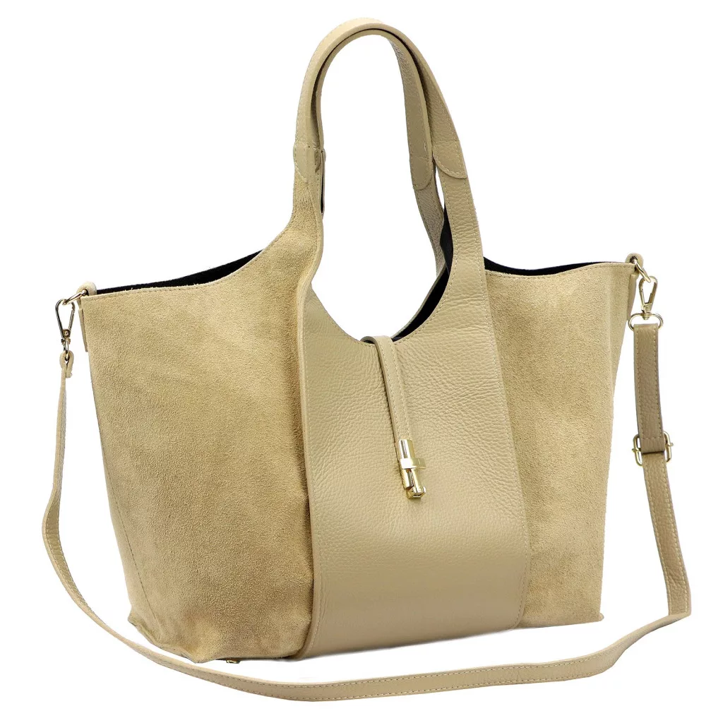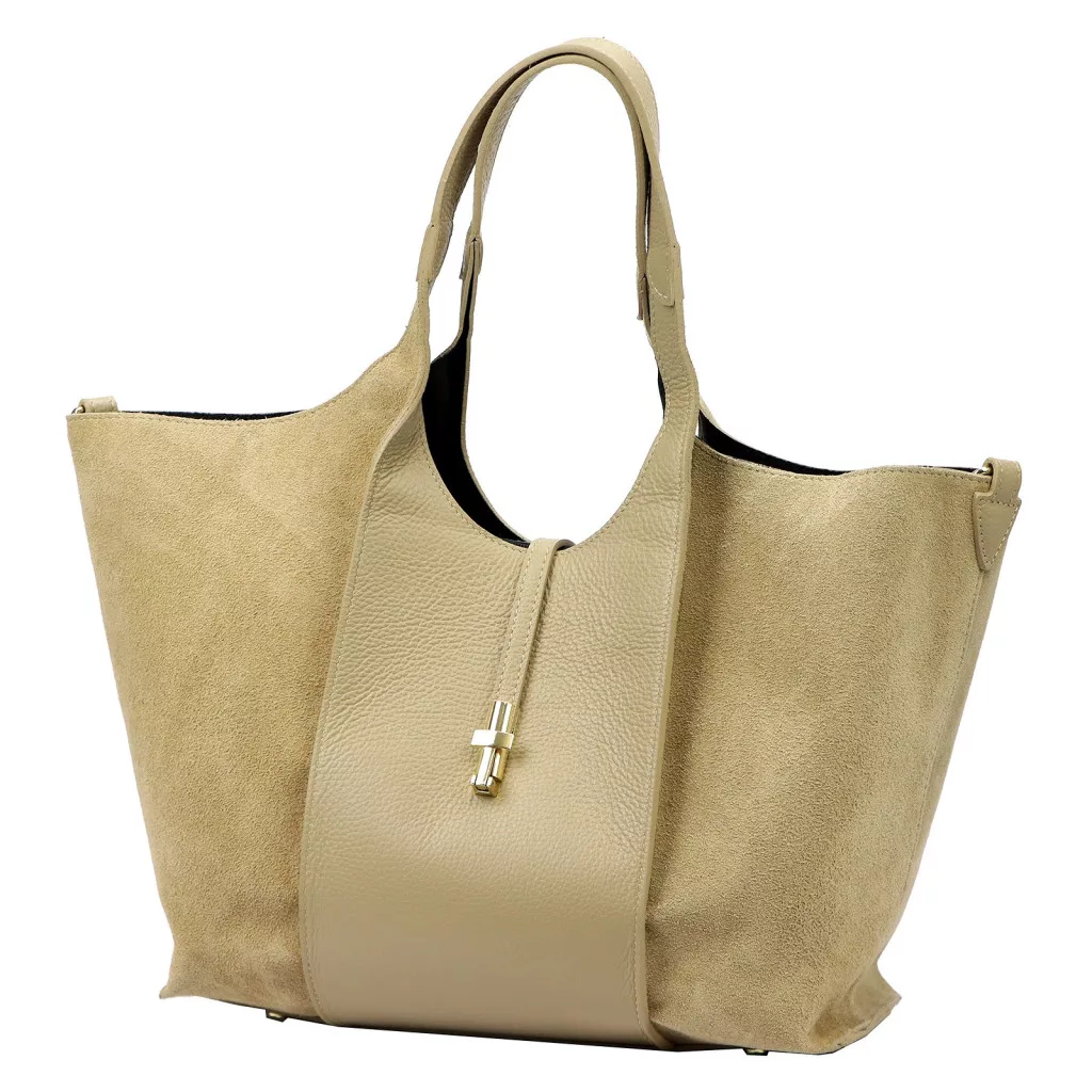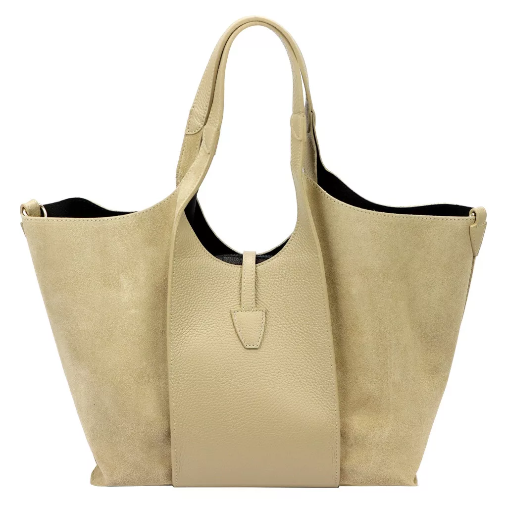 Elegáns, városi és nőies megjelenés. A velúr bőr finom textúrája, a bézs árnyalat és a tágas kialakítás harmonikus, modern táskát eredményez, amely jól illeszkedik a mindennapi öltözködéshez.