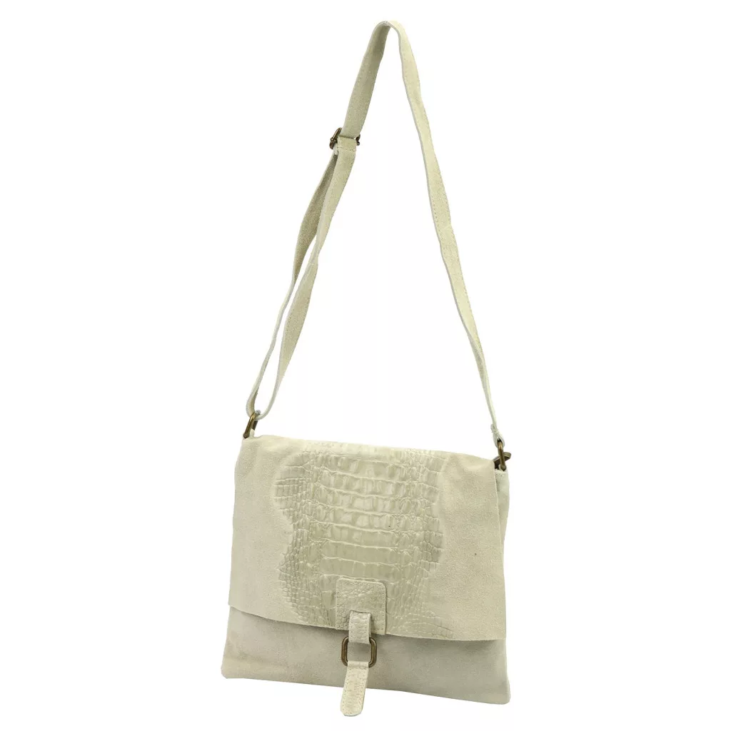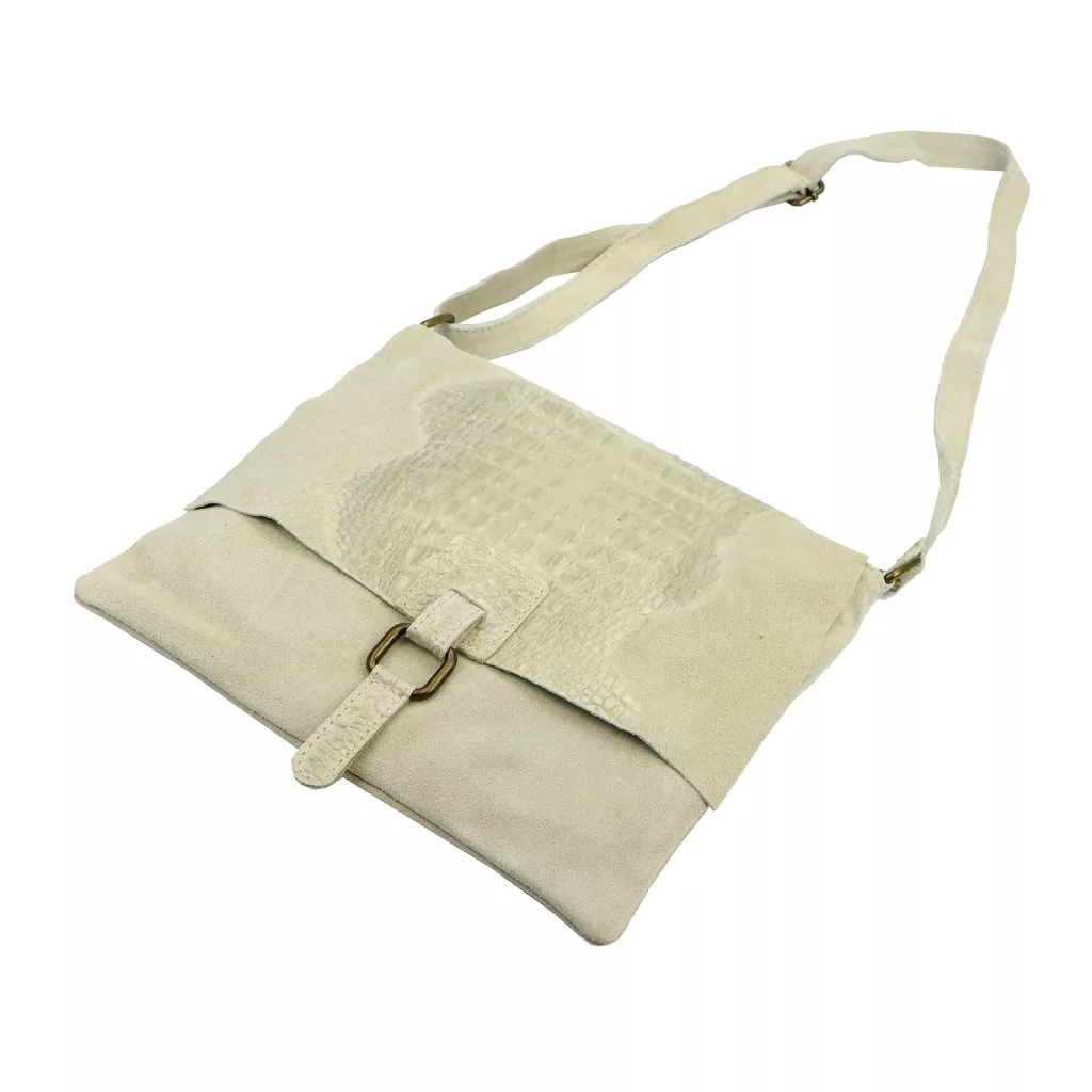 Nieduża torebka-listonoszka z najwyższej jakości, włoskiej, naturalnej skóry zamszowej. Skóra wyprawiana i barwiona wyłącznie naturalnymi garbnikami i barwnikami pochodzenia roślinnego i mineralnego. Na klapie torebki wytłoczono wzór skóry krokodyla. Torebka ma budowę jednokomorową, wykończoną trwałą podszewką, wyposażoną w kieszonkę zapinaną na suwak. Całość zamykana jest zamkiem błyskawicznym i klapą z zatrzaskiem magnetycznym. Długi pasek pozwala wygodnie nosić ją na ramieniu lub na ukos przez pierś.
