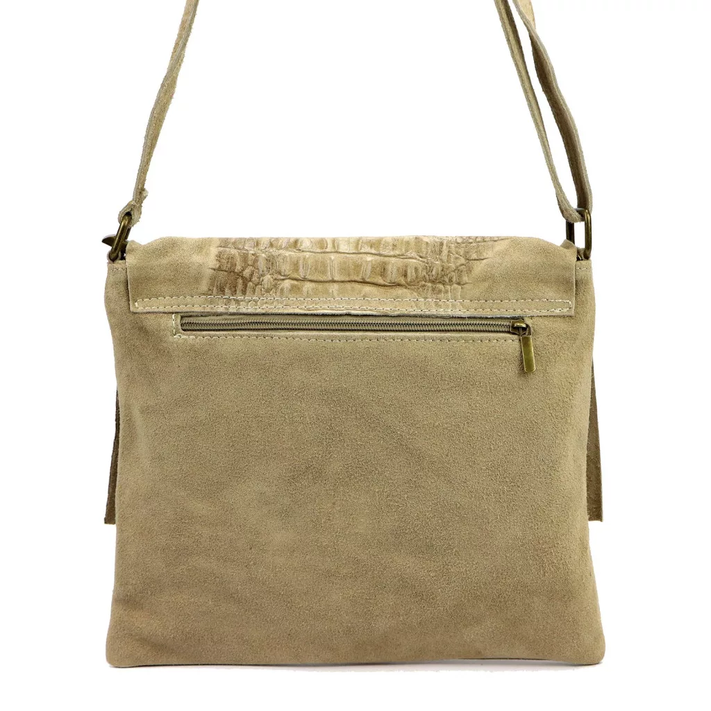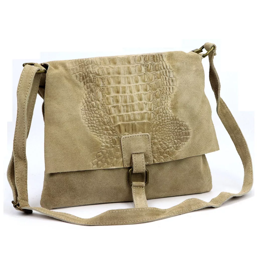 Nieduża torebka-listonoszka z najwyższej jakości, włoskiej, naturalnej skóry zamszowej. Skóra wyprawiana i barwiona wyłącznie naturalnymi garbnikami i barwnikami pochodzenia roślinnego i mineralnego. Na klapie torebki wytłoczono wzór skóry krokodyla. Torebka ma budowę jednokomorową, wykończoną trwałą podszewką, wyposażoną w kieszonkę zapinaną na suwak. Całość zamykana jest zamkiem błyskawicznym i klapą z zatrzaskiem magnetycznym. Długi pasek pozwala wygodnie nosić ją na ramieniu lub na ukos przez pierś.