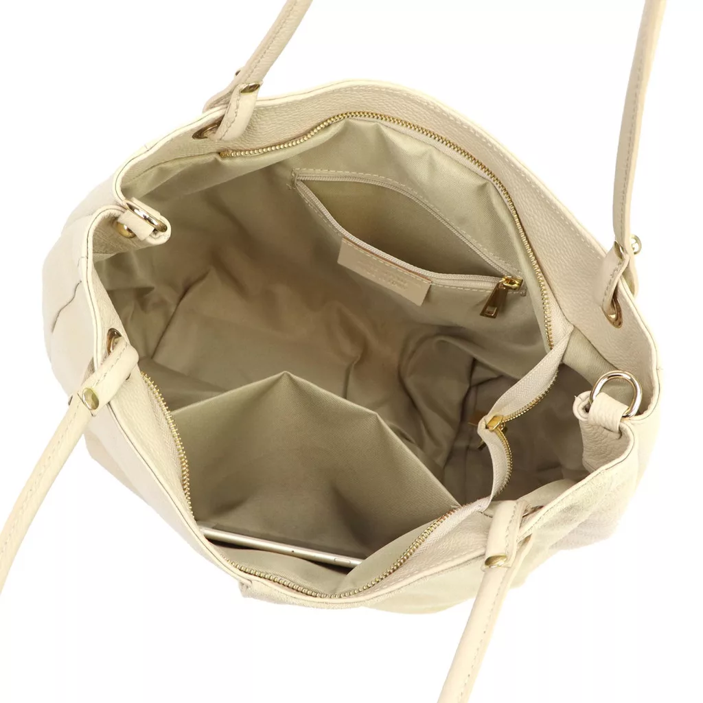 Elegáns, nőies és kifinomult megjelenés. A világos bézs árnyalat és a hobo jellegű forma harmonikus, könnyed stílust eredményez.