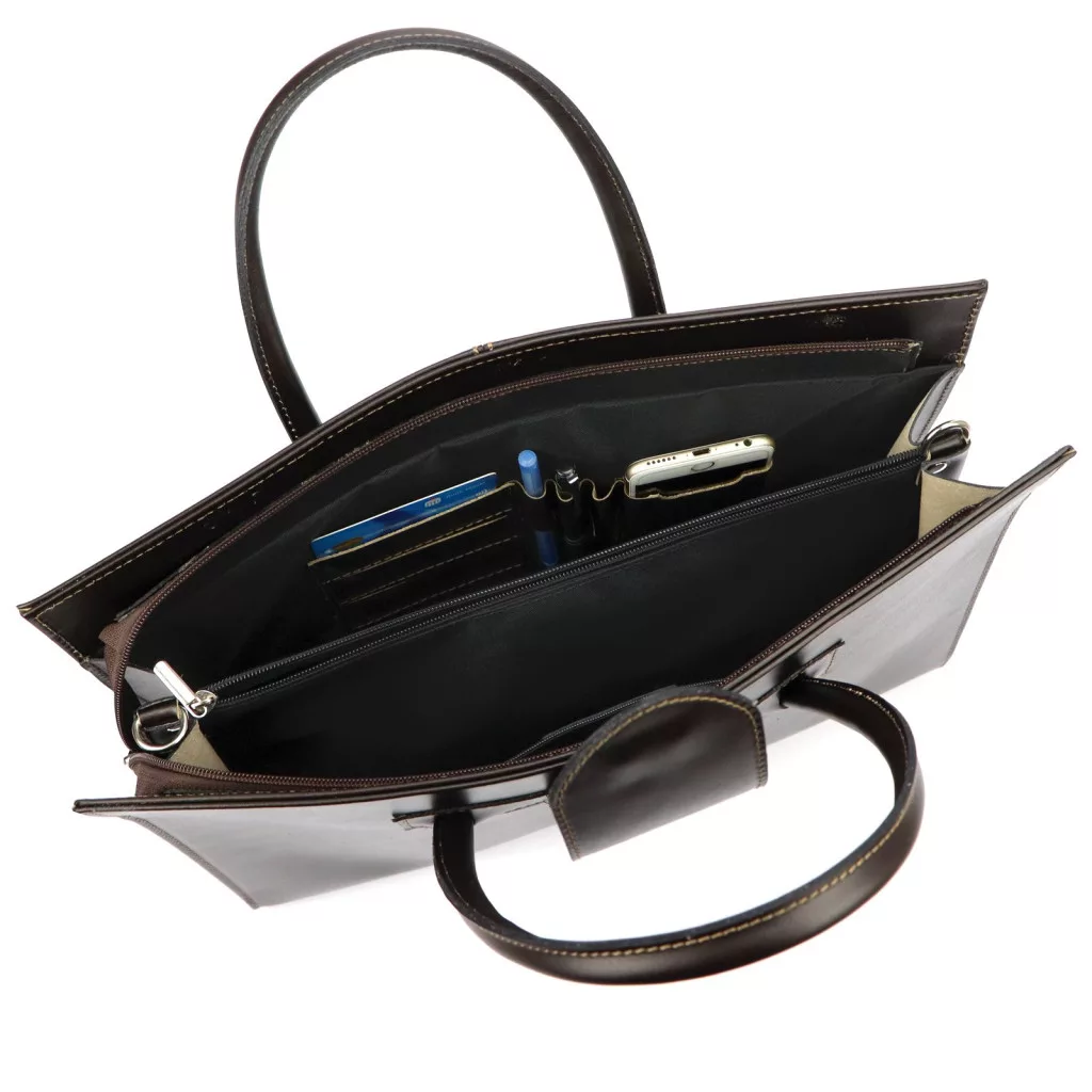 A Camilla 778 elegáns és kifinomult női aktatáska, amely a professzionális megjelenést ötvözi a praktikus funkcionalitással. Kiváló minőségű marhabőrből készült, így tartós, időtálló és prémium érzetű. Sötétbarna színe klasszikusan elegáns és időtálló, tökéletes választás üzleti környezetbe és mindennapi használatra egyaránt. Merev oldalfalai stabil tartást biztosítanak, így a benne tárolt iratok, eszközök és okoseszközök mindig rendezettek és biztonságban maradnak. Átgondolt belső elrendezése lehetővé teszi a mindennapi kellékek – dokumentumok, laptop vagy tablet, noteszek – könnyed rendszerezését.