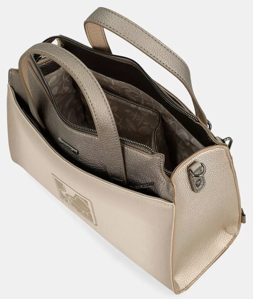 A két kényelmes fogantyú elegáns kézitáskaként való hordást tesz lehetővé, a vállpánt pedig alternatív viselési módot biztosít, így a táska vállon hordva is praktikus választás.