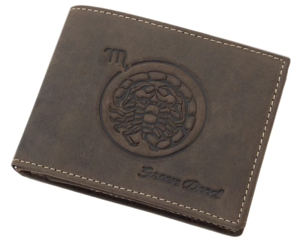 GreenDeed bőr pénztárca Skorpió csillagjegy motívummal – karakteres megjelenés és személyes üzenet egyetlen kiegészítőben. A pénztárca elülső oldalán megjelenő horoszkópos Skorpió motívum az erőt, szenvedélyt és határozottságot szimbolizálja, így tökéletes választás mindazok számára, akik büszkén vállalják csillagjegyük egyediségét. A valódi bőrből készült pénztárca elegáns, mégis markáns stílust képvisel, amely jól illeszkedik a mindennapi használathoz.