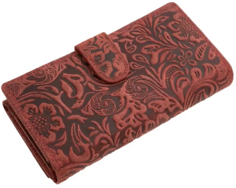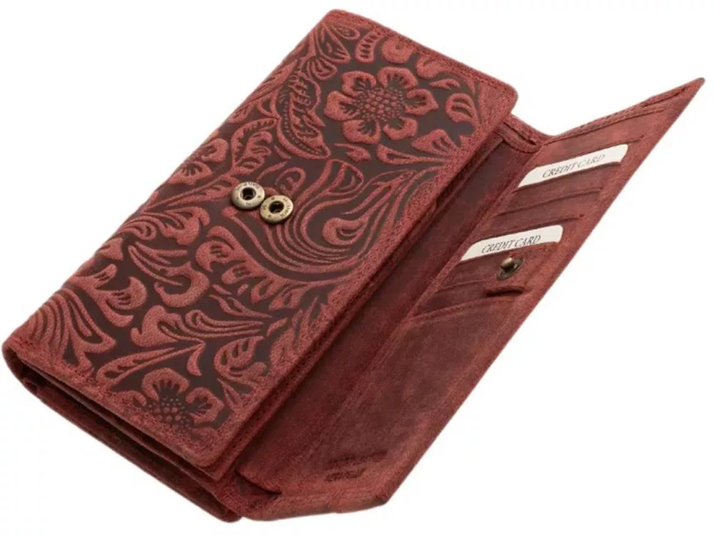 Divatos színekben virágmintával díszített minőségi valódi bőr női pénztárca, mely nagyméretű, praktikus kialakítású GreenDeed márkás modell.