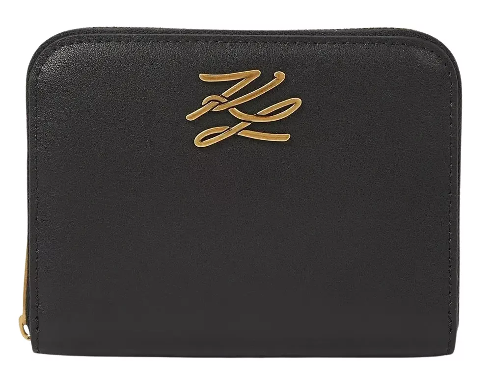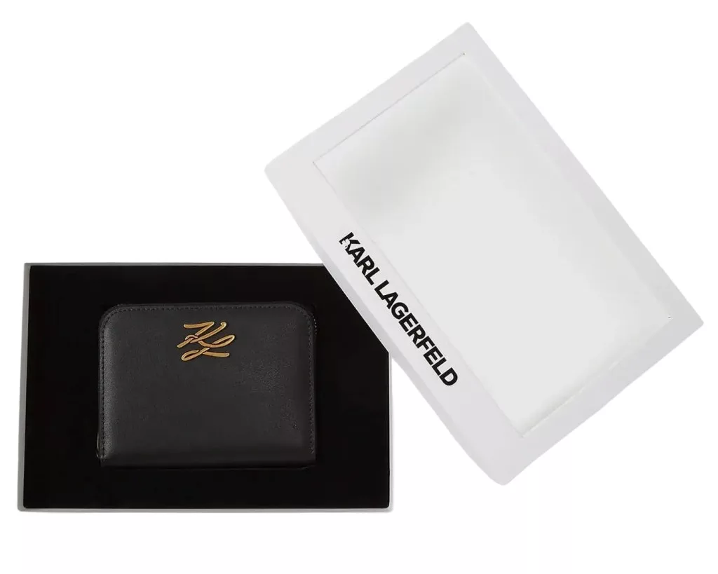 A Karl Lagerfeld fekete női valódi bőr pénztárca elegáns és kifinomult kiegészítő, amely a luxus és a funkcionalitás tökéletes harmóniáját kínálja. Letisztult formavilága és finom részletei – köztük az elülső Autograph fém díszítés – a Karl Lagerfeld ikonikus stílusát tükrözik. Ideális választás mindennapi használatra, hiszen praktikus kialakítása lehetővé teszi a kártyák, készpénz és aprópénz átlátható, biztonságos tárolását.