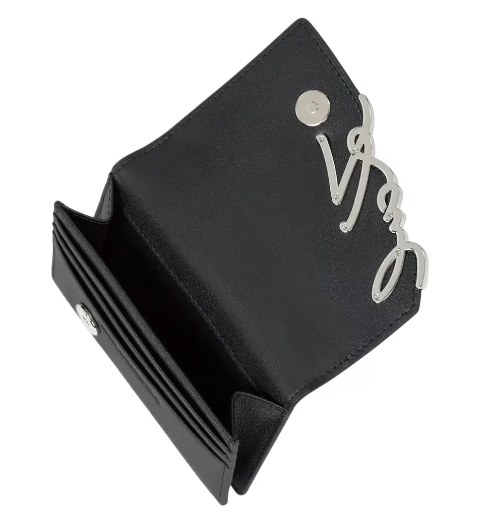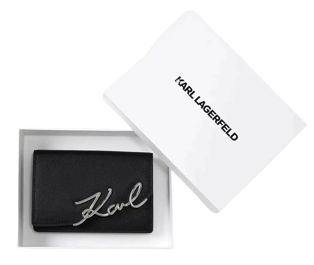 A Karl Lagerfeld fekete női valódi bőr pénztárca elegáns, kompakt és praktikus kiegészítő, amely a letisztult stílust és a mindennapi funkcionalitást tökéletesen ötvözi. Finom, puha tapintású bőr felülete és az elülső fedélen elhelyezett ikonikus KARL Signature fém díszítés a márka jellegzetes eleganciáját tükrözi.