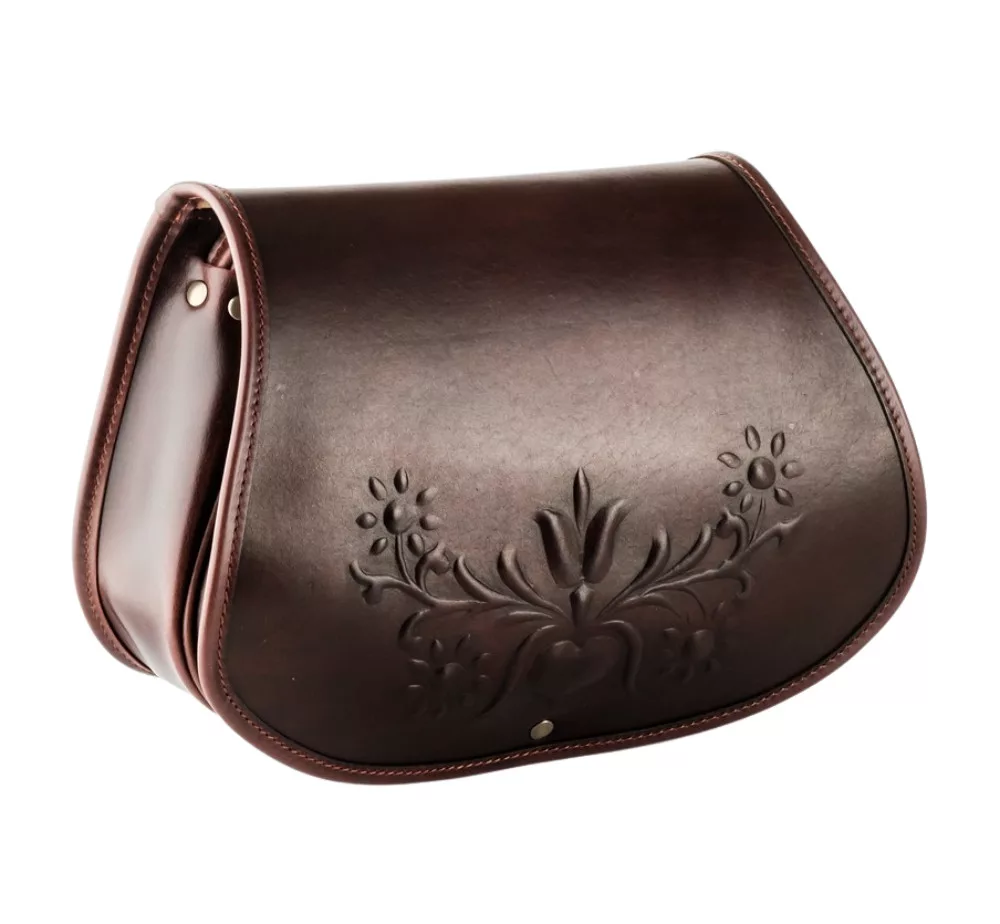 A vadász táska elosztása: egy nagy rekesz, elöl egy nyitott rekesz. A bőr táska szabályozható hosszúfogóval készült, fedele csattal záródik, szélei szegettek.