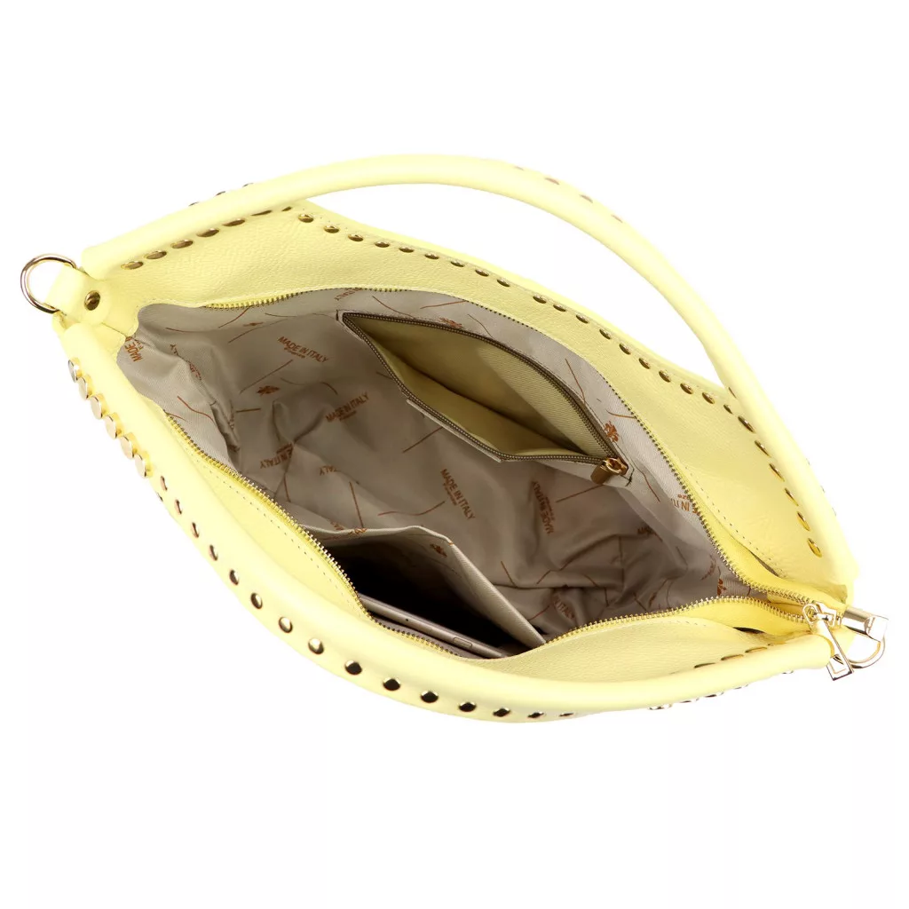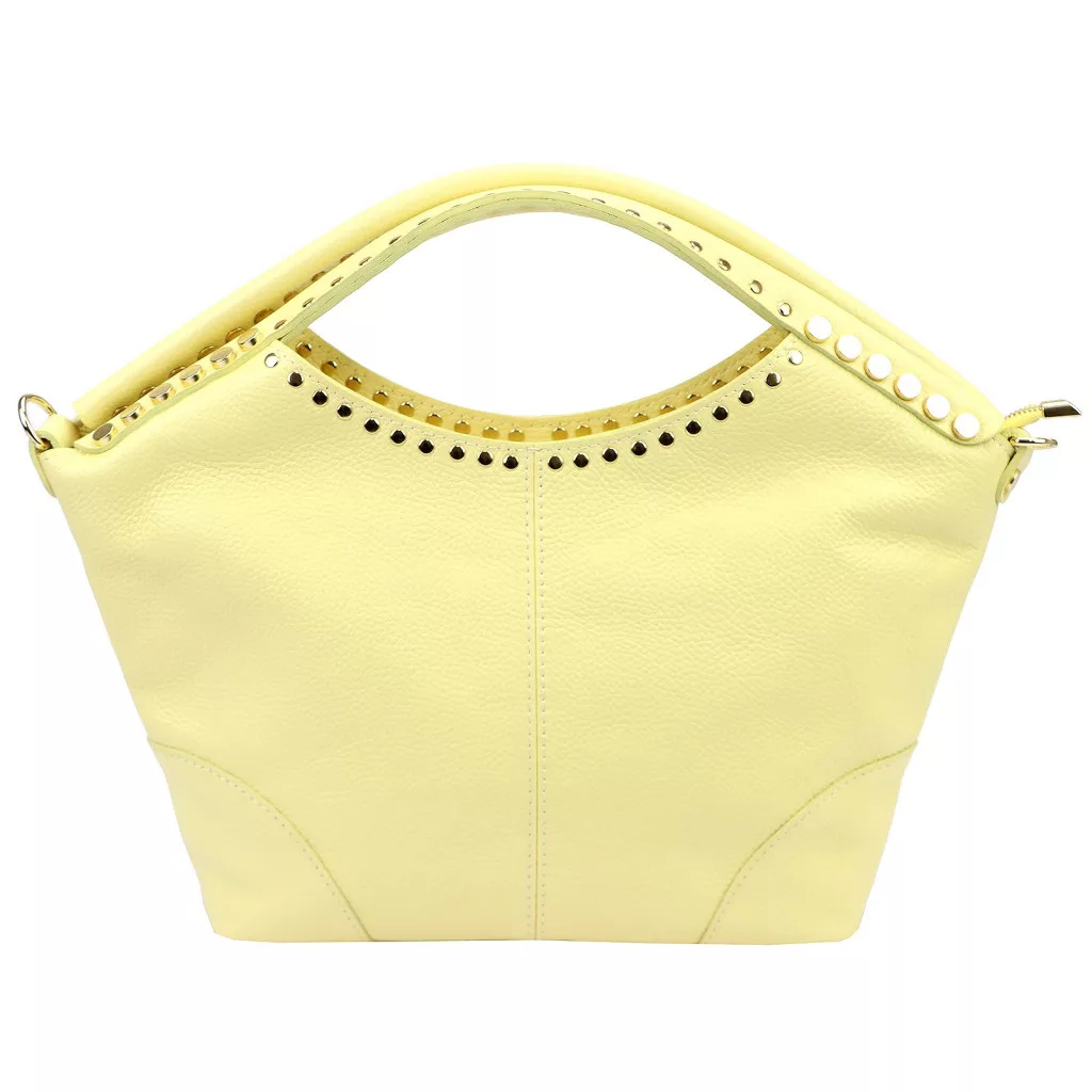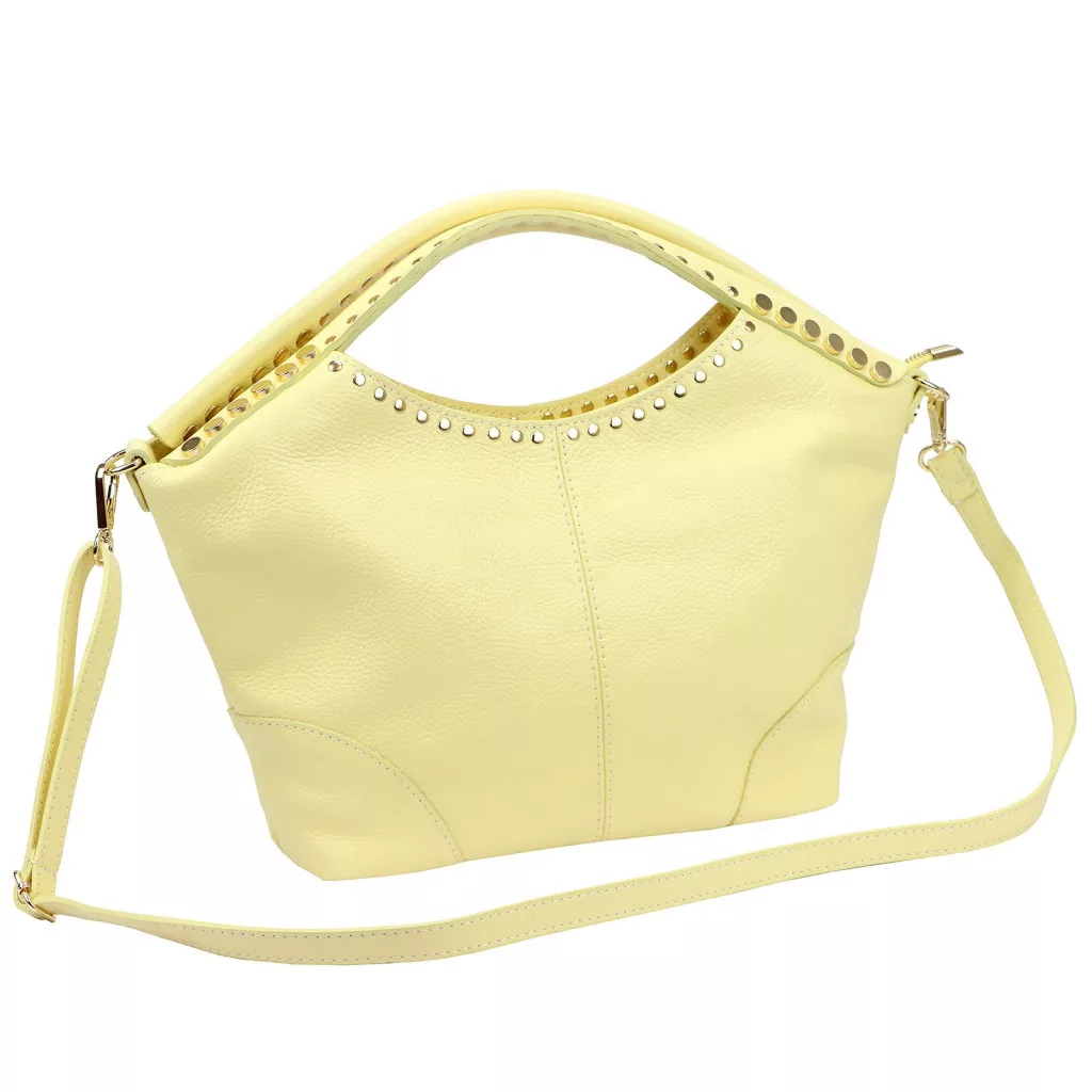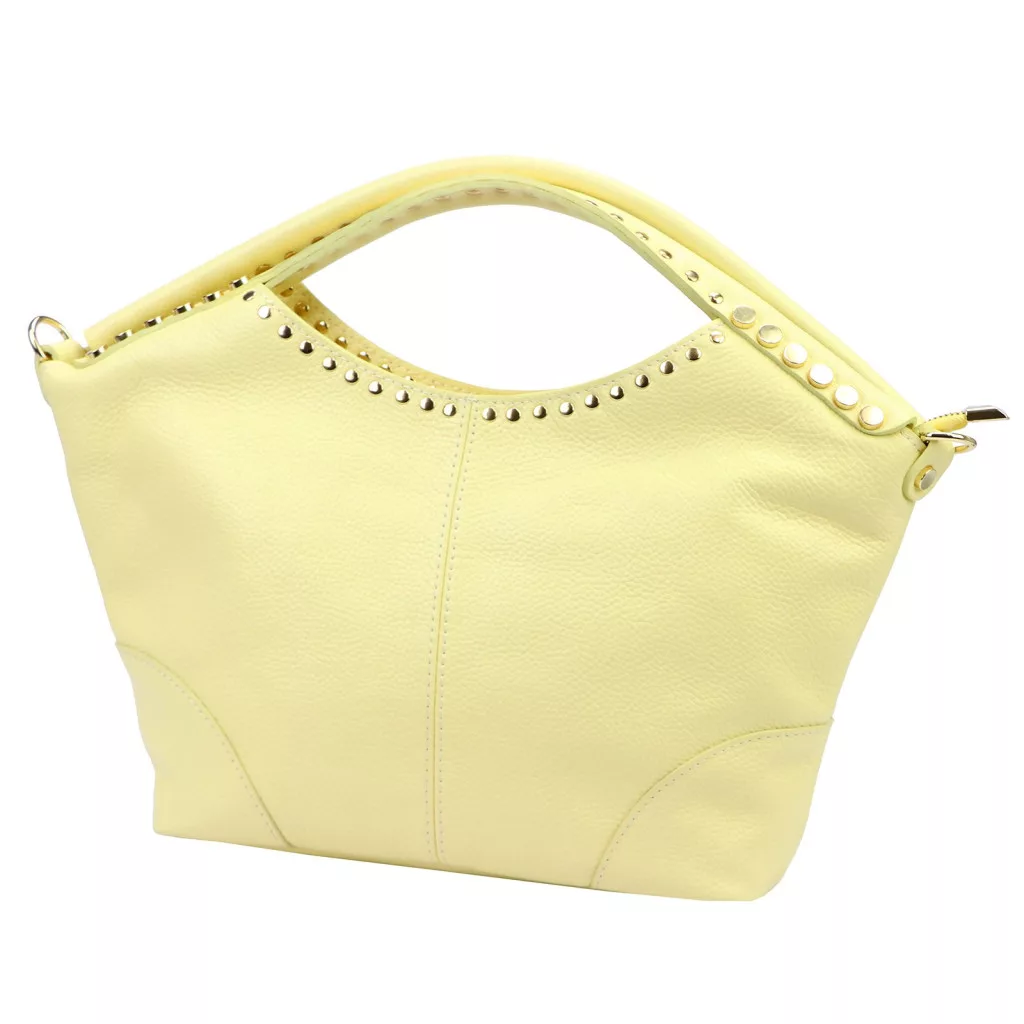 Puha tapintású, természetes esésű bőrből készült kézitáska, amelyet a felső részen végigfutó szegecses díszítés tesz egyedivé. A dupla kézifogó íves kialakítása elegáns megjelenést biztosít, miközben kényelmes fogást nyújt.