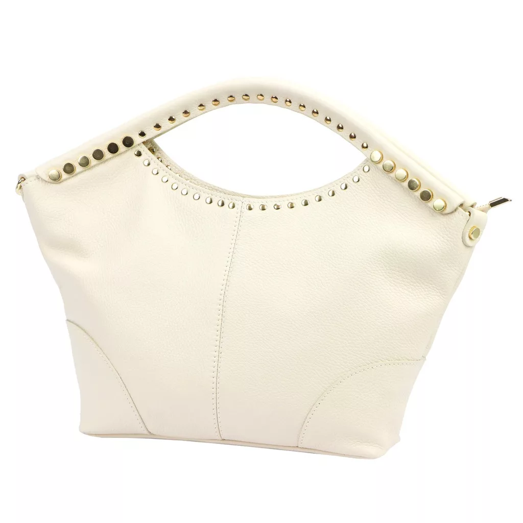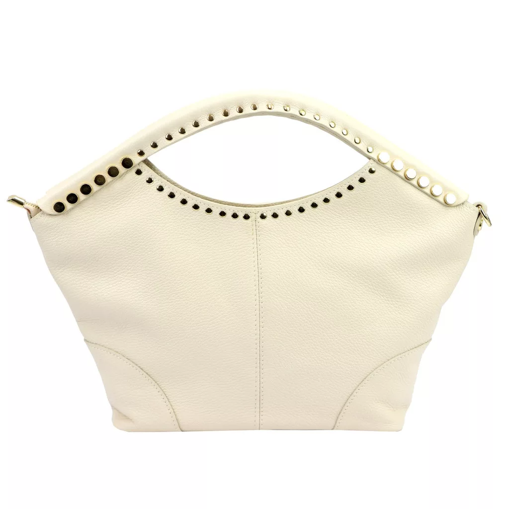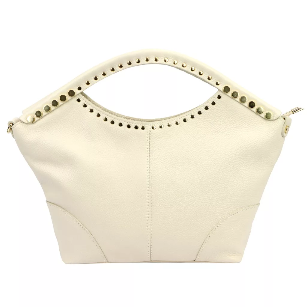 Puha, kellemes tapintású bőrből készült kézitáska, amelyet a felső részen körbefutó szegecses díszítés tesz különlegessé. A dupla kézifogó íves formája elegáns megjelenést kölcsönöz, miközben kényelmes fogást biztosít.