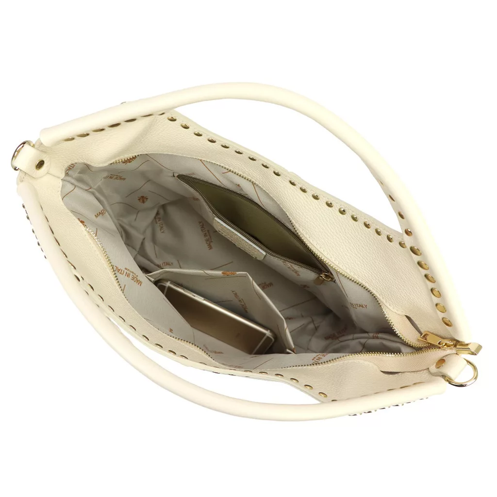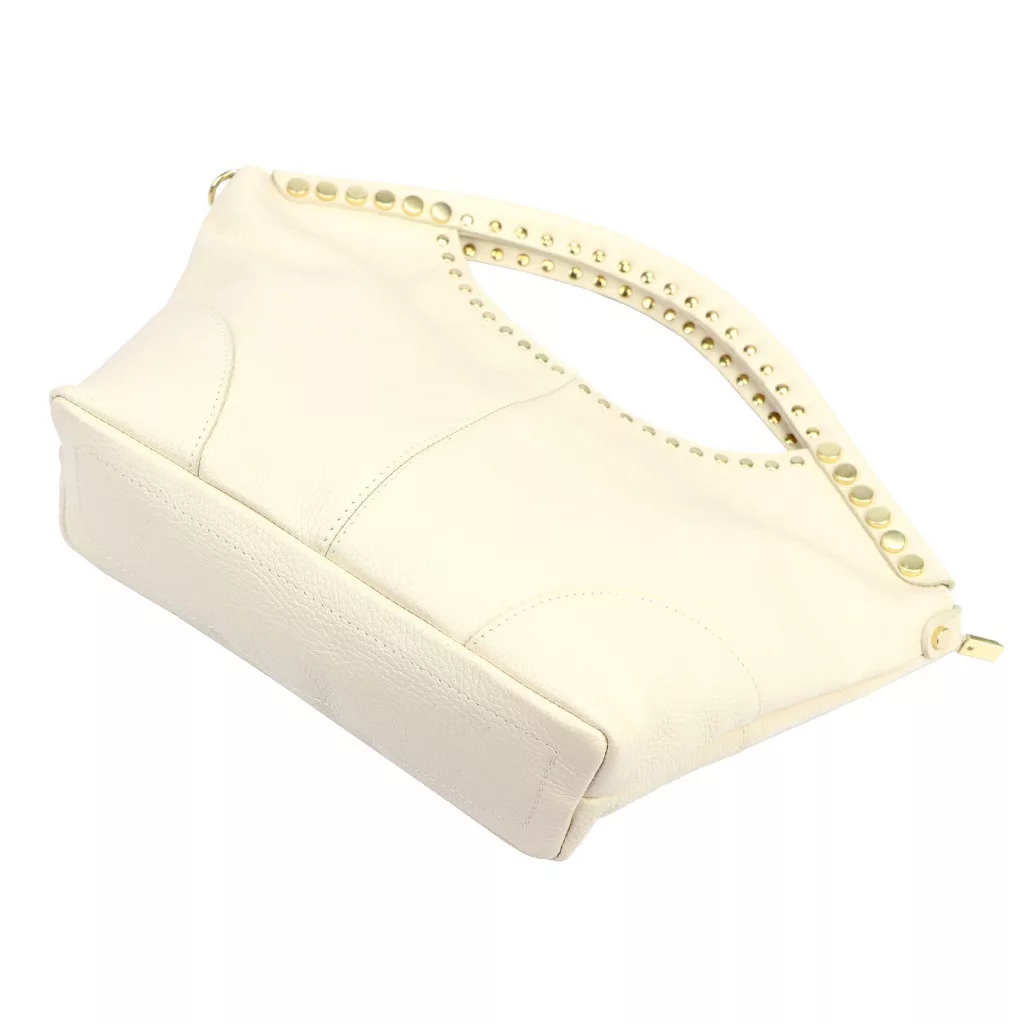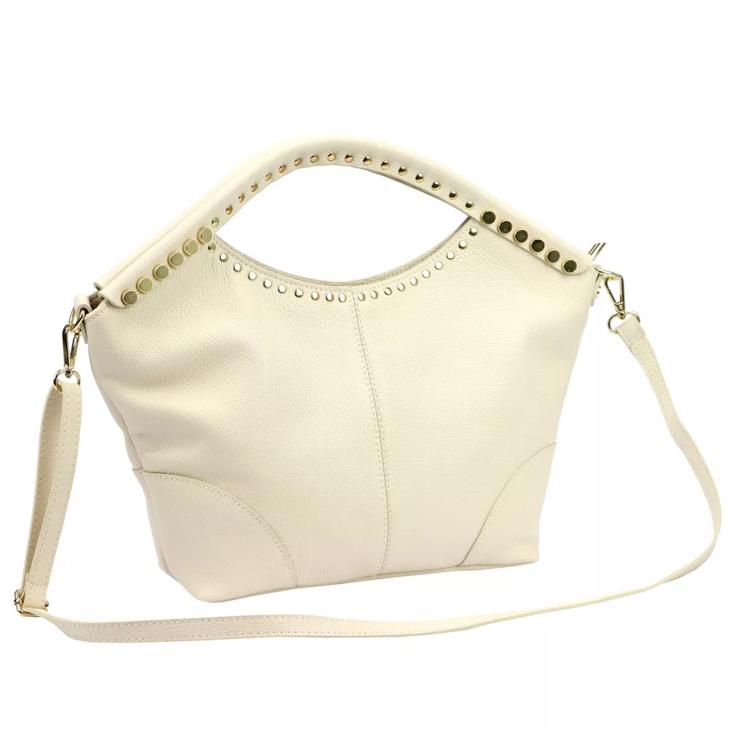 Puha, kellemes tapintású bőrből készült kézitáska, amelyet a felső részen körbefutó szegecses díszítés tesz különlegessé. A dupla kézifogó íves formája elegáns megjelenést kölcsönöz, miközben kényelmes fogást biztosít.