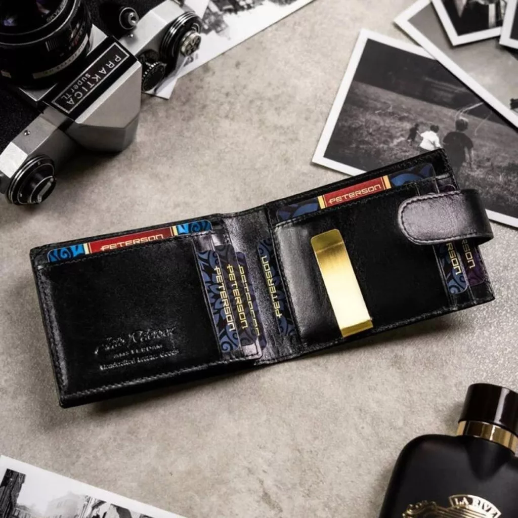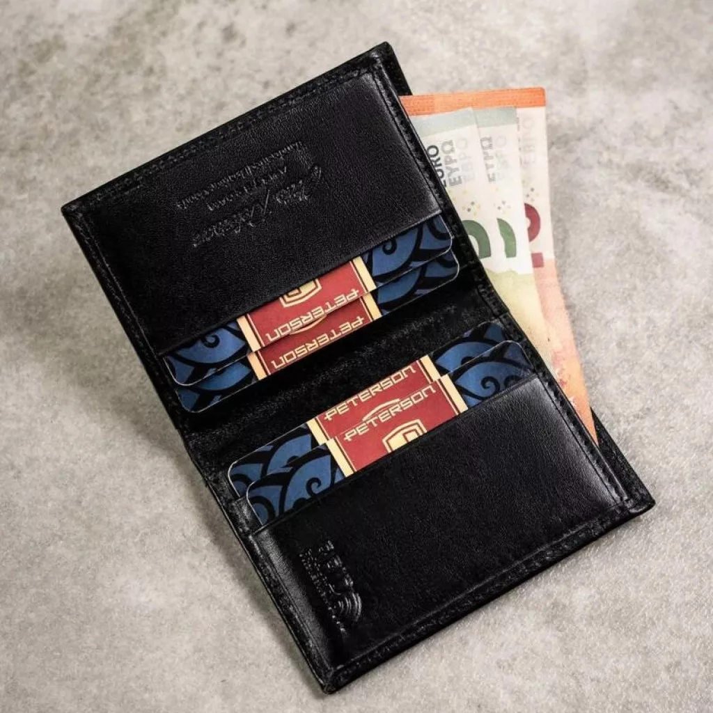 Belső kialakítása átgondolt és funkcionális, összesen 10 darab bankkártya vagy igazolvány tárolására alkalmas rekesszel rendelkezik, ezek közül egy hálós kialakítású. A nyitott, patentos aprópénztartó könnyű hozzáférést biztosít az apróhoz. A papírpénz rögzítésére fém bankjegycsipesz szolgál, amely karcsú megoldást kínál a hagyományos rekeszek helyett. A kihajtható belső elemek növelik az átláthatóságot és a tárolókapacitást. A pénztárcát dombornyomott Peterson márkajelzés és diszkrét fém logó díszíti.