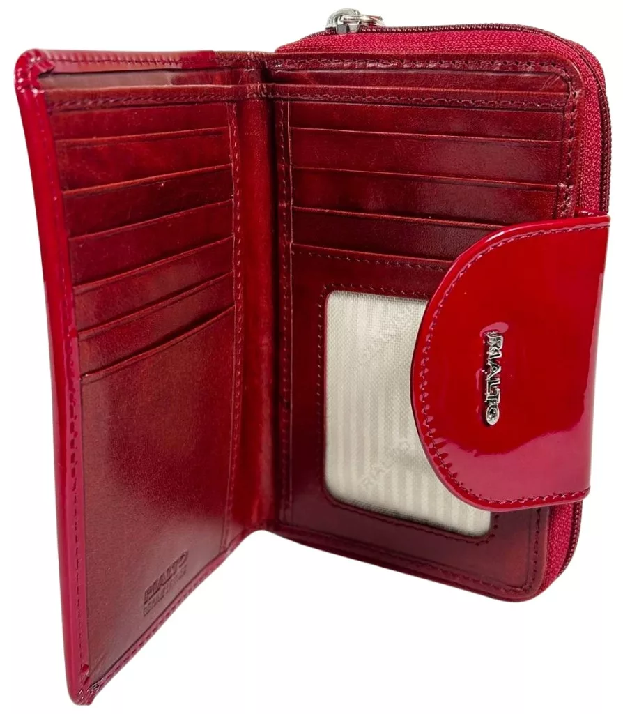 Cipzárral záródó érme tartója 4 rekeszre osztott, 7 db kártyatartó kapott helyet, és egy cipzáras aprópénz tartó. A pénztárca másik oldalán egy fém, Rialto logóval díszített, átfogópántos, patenttal záródó papírpénz tartó, irat és kártyatartó kapott helyet. Ebben 10 kártyatartó, 2 irattartó található. Hátsó külső falán Rialto márkanévvel díszített fém húzós, cipzáras zseb található.