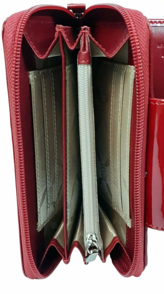 Gyönyörű, bőrből készült kompakt női pénztárca. Közepes méretű, igazán praktikus elrendezésű, belsejében több pénztartó rekesszel, irattartóval, kártyatartókkal.