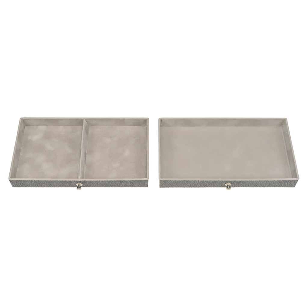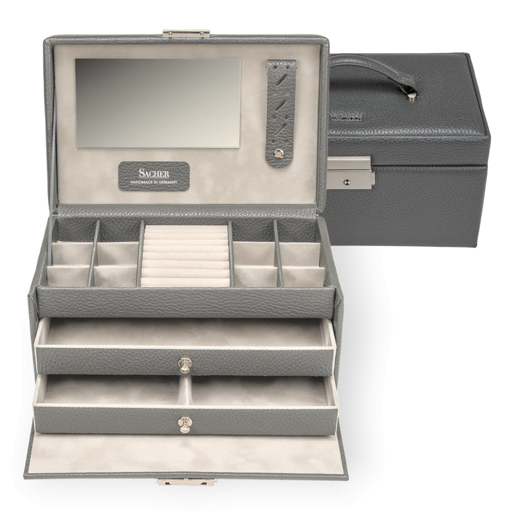 A Sacher Emma szürke ékszerdoboz a német kézművesség időtlen eleganciáját és precizitását képviseli. Valódi bőrből, kézzel készült Németországban, ez a luxus ékszertartó tökéletes megoldást kínál értékes ékszereid biztonságos és stílusos tárolásához. A letisztult szürke árnyalat modern, visszafogott eleganciát sugároz, miközben harmonikusan illeszkedik bármilyen enteriőrbe.