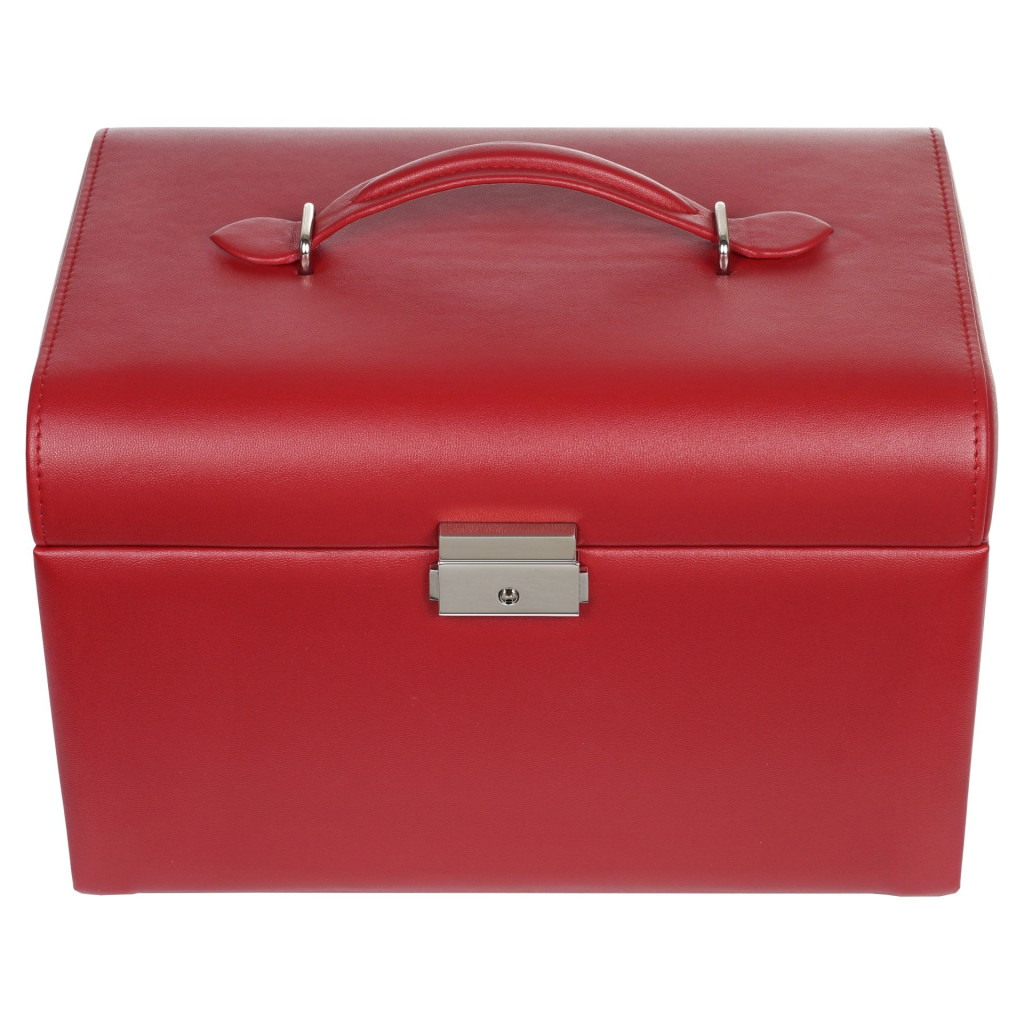 A belső elrendezés praktikus és áttekinthető: két nagyméretű, osztott fiók, különböző rekeszek, gyűrűpárna, valamint fedél alatti tükör gondoskodik a kényelmes használatról. A védőfüllel ellátott külön rekesz és a varrott zseb ideális kisebb kiegészítők számára, míg a masszív hordozófogantyú és a zárható kialakítás biztonságos szállítást és tárolást biztosít.