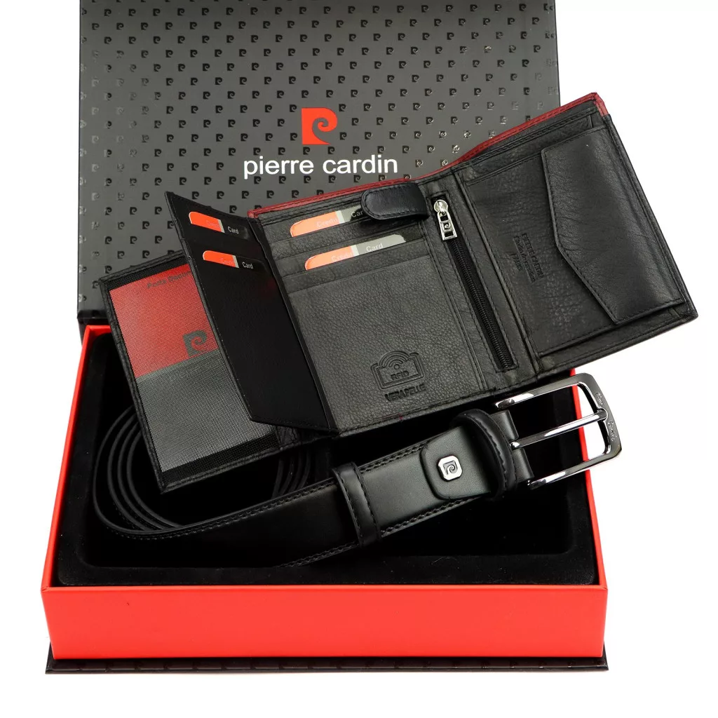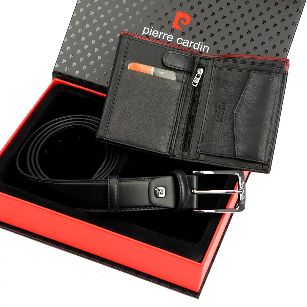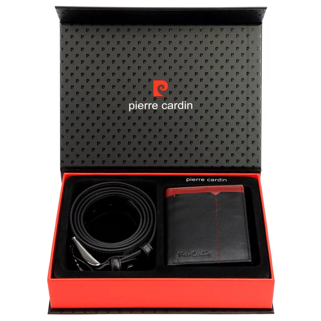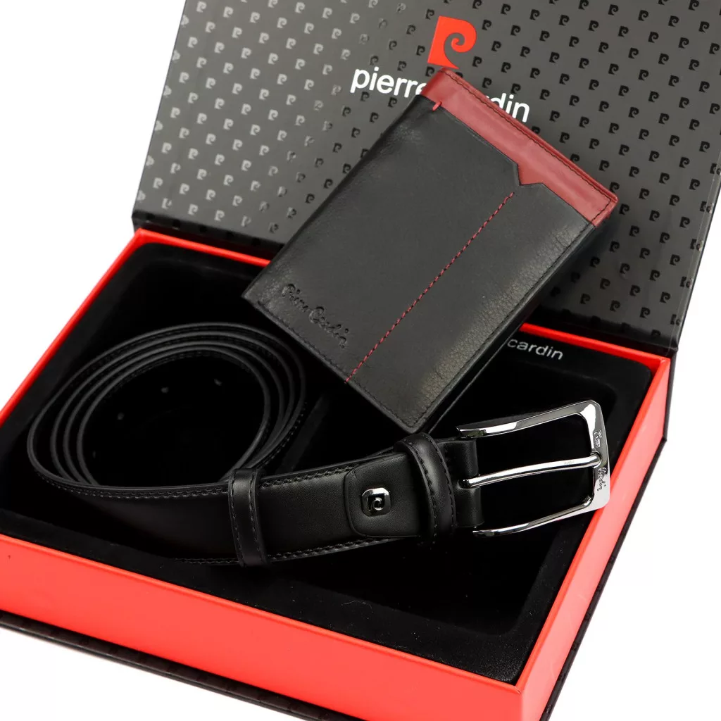 Pierre Cardin ZG-142 fekete-piros férfi bőr pénztárca, öv ajándék szett 130 cm