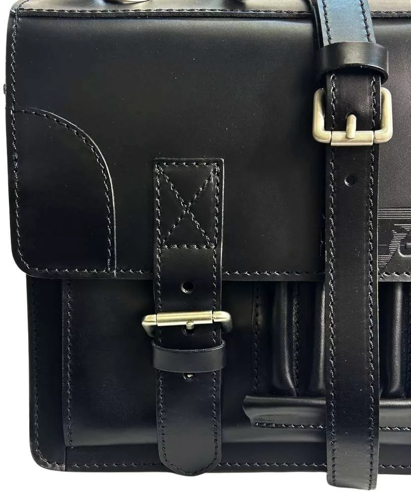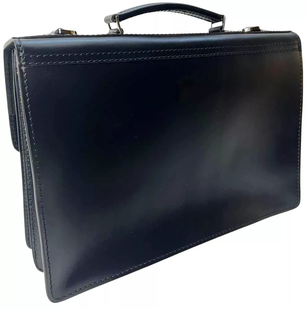 Selyemfényű, amerikai jellegű marhabőrből készült, két nagy rekeszes, cipzáras válaszfallal, előrészen nagy zsebbel. Hat darabos tolltartóval, mobil és névjegytartóval, szabályozható hosszúságú vállpánttal. Festett, vágott szélű bőr aktatáska.
