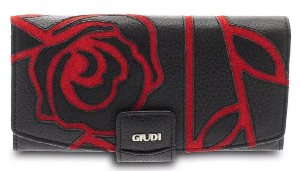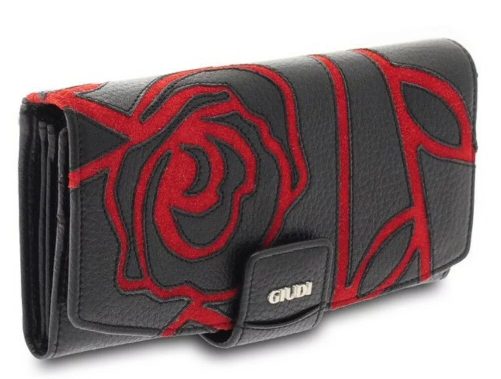 Giudi női, nagyméretű, kézzel rávarrt lakkbőr rózsás, fekete-piros bőr pénztárca