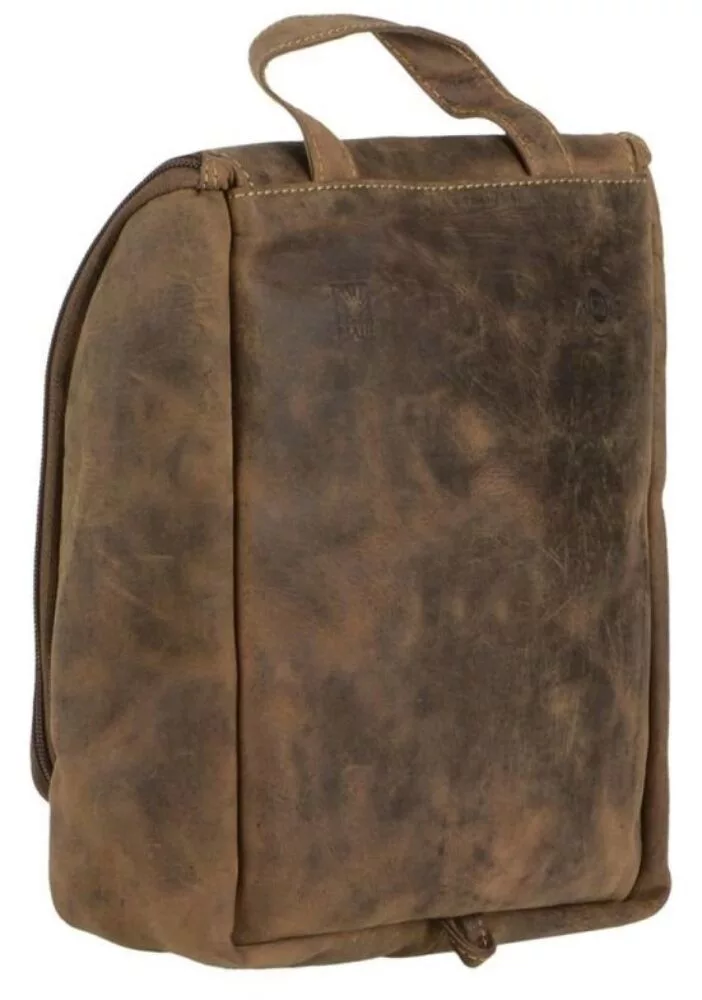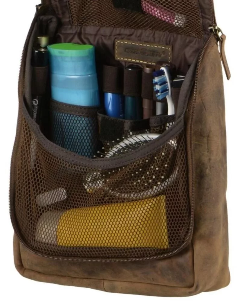 A Greenburry Vintage kollekciójának antik hatású barna marhabőr neszeszere nem csak stílusos megjelenése miatt jó választás, hanem funkcionális kialakítása miatt is, hiszen lehetővé teszi a tisztálkodási eszközök könnyed tárolását. Fő rekesze cipzárral ellátott, melyben találhatunk három nyitott hálós zsebet, illetve tíz kisebb gumis rögzítő zsebet is. A neszeszer fedelén belülről elhelyezésre került egy-egy cipzárral zárható zseb is, melynek köszönhetően a kisebb dolgok tárolása is könnyen megvalósítható. A kozmetikai táska belsejében egy fogantyú került elhelyezésre, mely a szállítás elősegítését szolgálja.