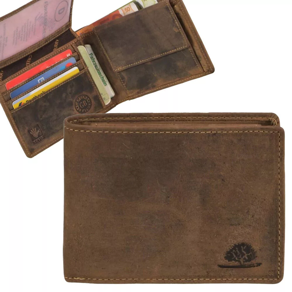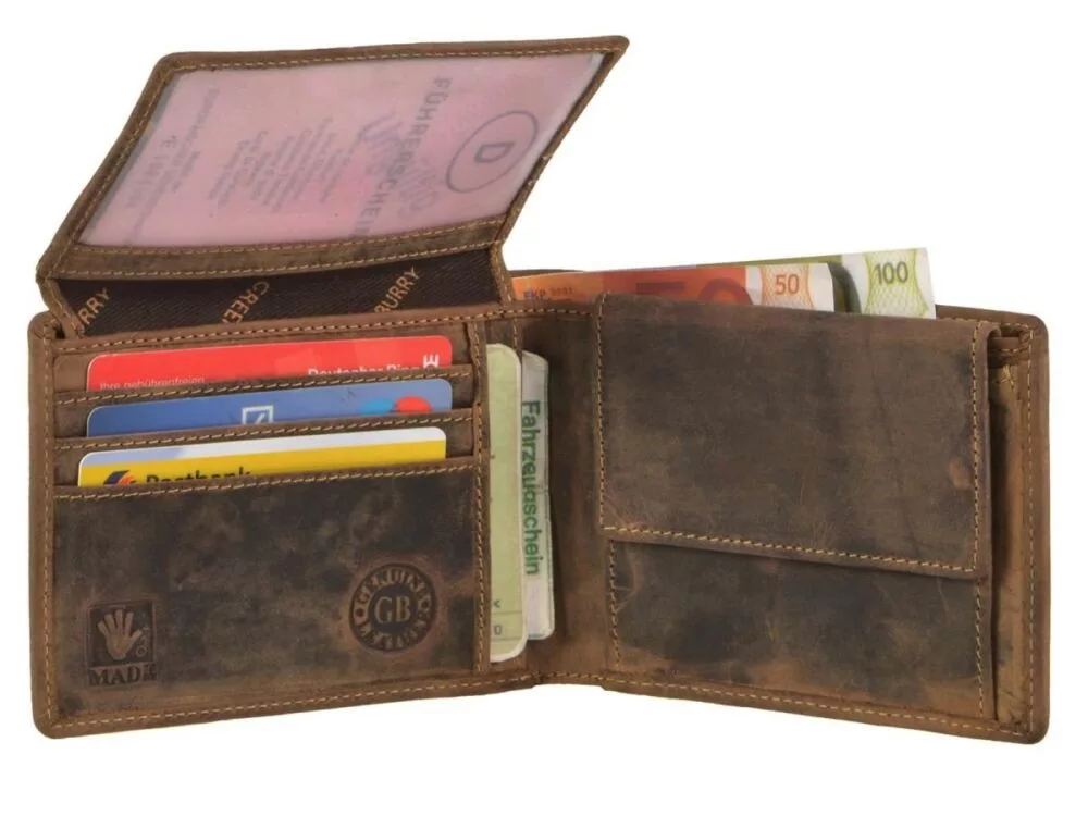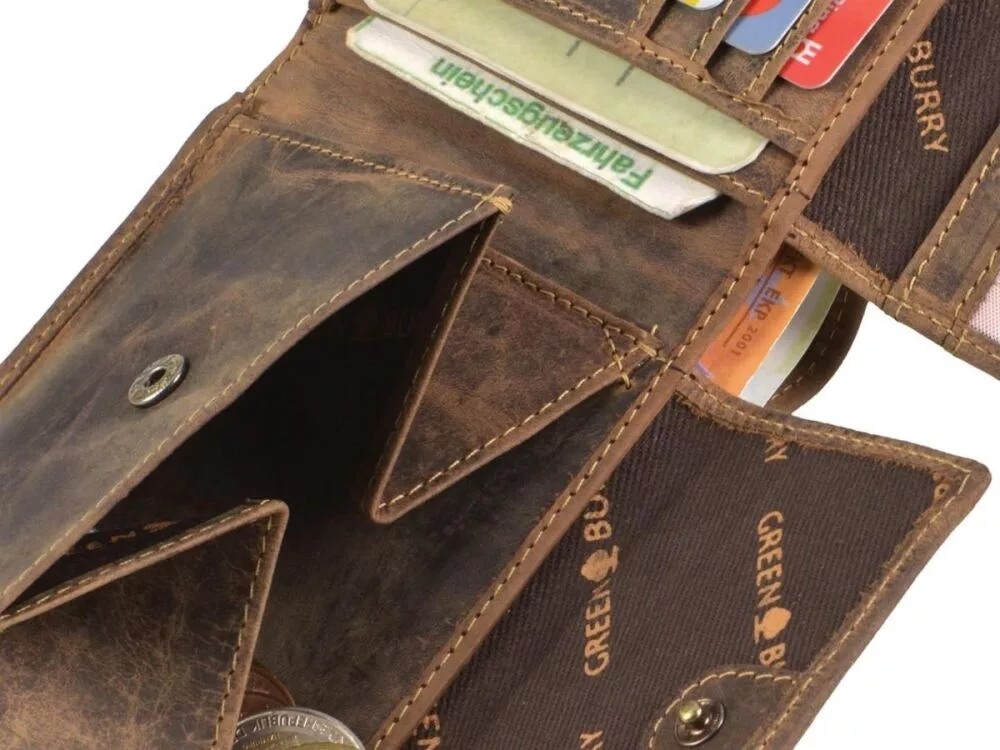 A Greenburry csak első osztályú bőrt használ a pénztárcáihoz, amely garantálja a hosszú élettartamot és a tökéletes felhasználói élményt. Fedezze fel a klasszikus, erős anyagból készült Greenburry Vintage  pénztárcákat természetes, csiszolt marhabőrből, gondosan megtervezett elrendezéssel, motoros és teherautó-változatként rusztikus láncszíjjal és szegecselt patentokkal. Erős, elegáns textúrájú és illatos bőrének köszönhetően mindegyik modell érzéki élmény.