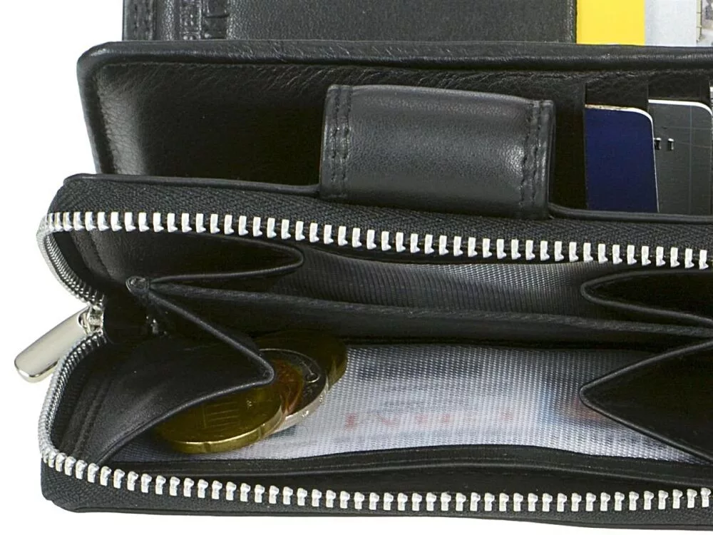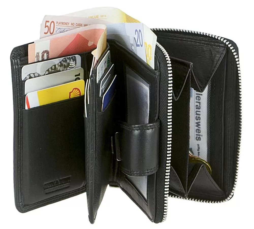 - 1 cipzáras két részből álló érmezseb melyekben 2 további áttetsző zseb található vezetői engedély, vagy kártya tárolására.
