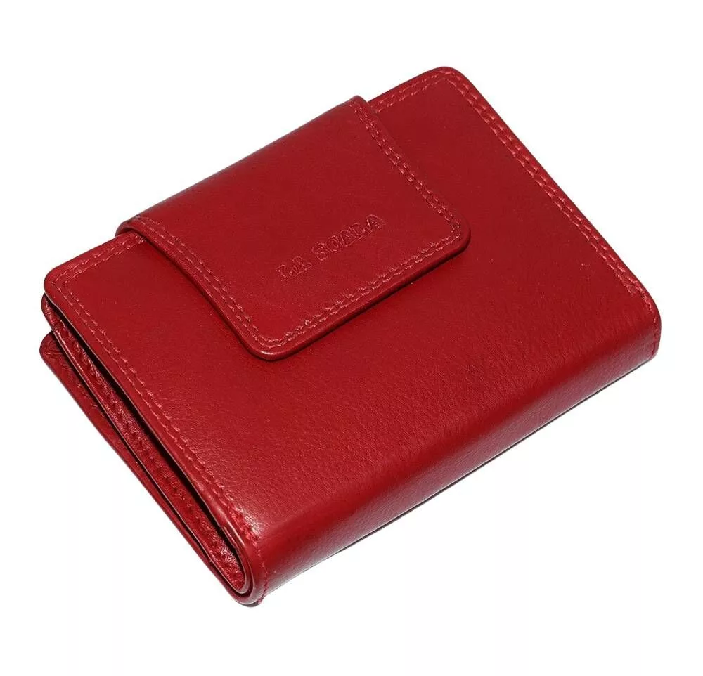 Kiváló minőségű, kellemes tapintású, tartós puha bőrből készült női pénztárca piros színben, a fedélen La Scala felirattal.