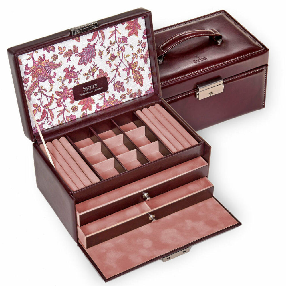 A kiváló minőségéről ismert 160 éves német Sacher cég által, németországi manufaktúrában, teljes egészében kézi munkával készített ékszerdoboz.