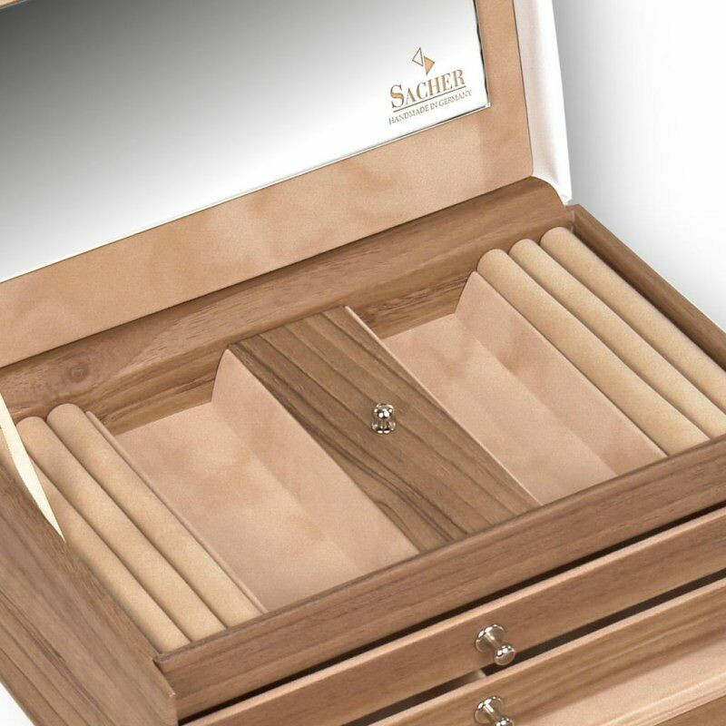 A kiváló minőségéről ismert, 160 éves német Sacher cég által, németországi manufaktúrában, teljes egészében kézi munkával készített ékszerdoboz.