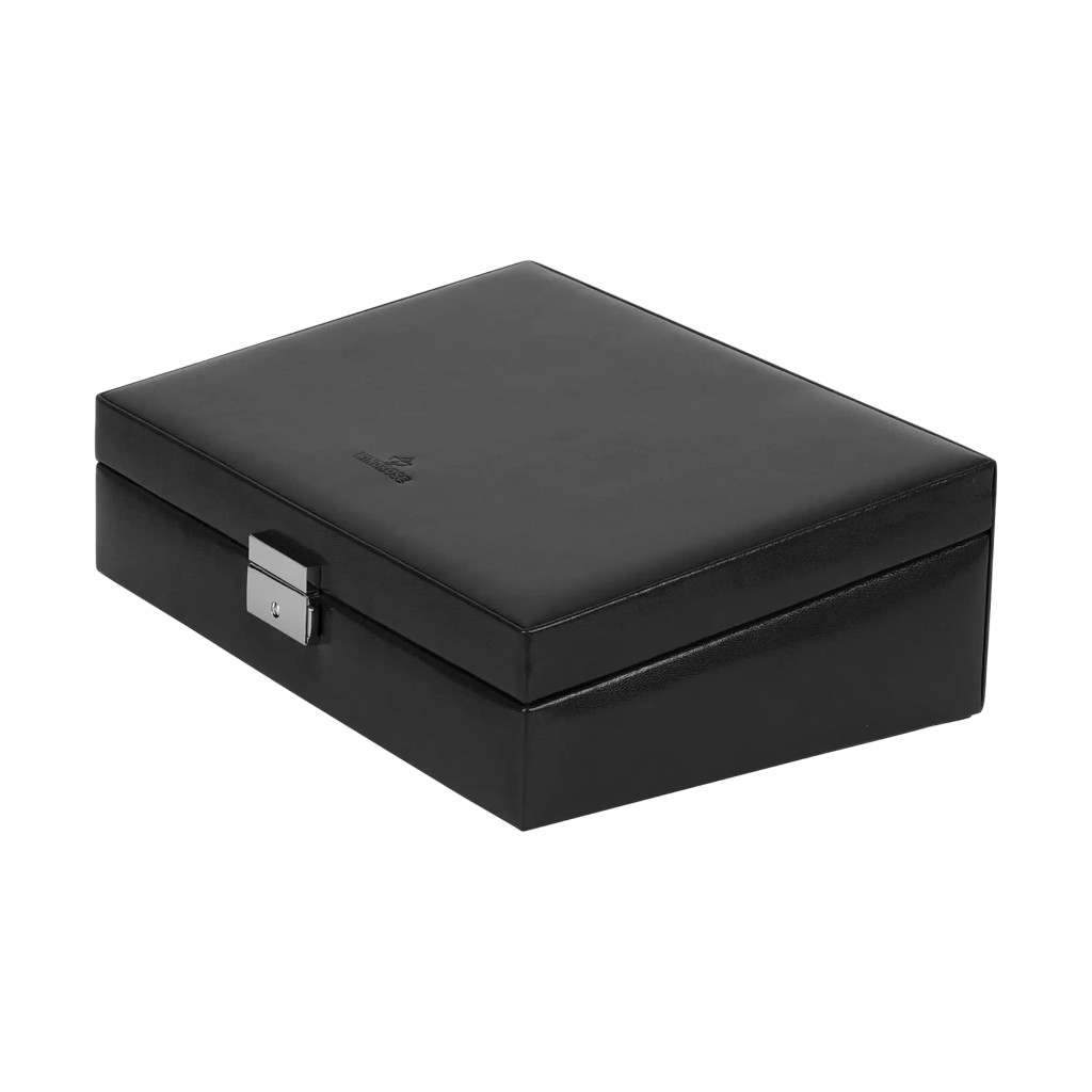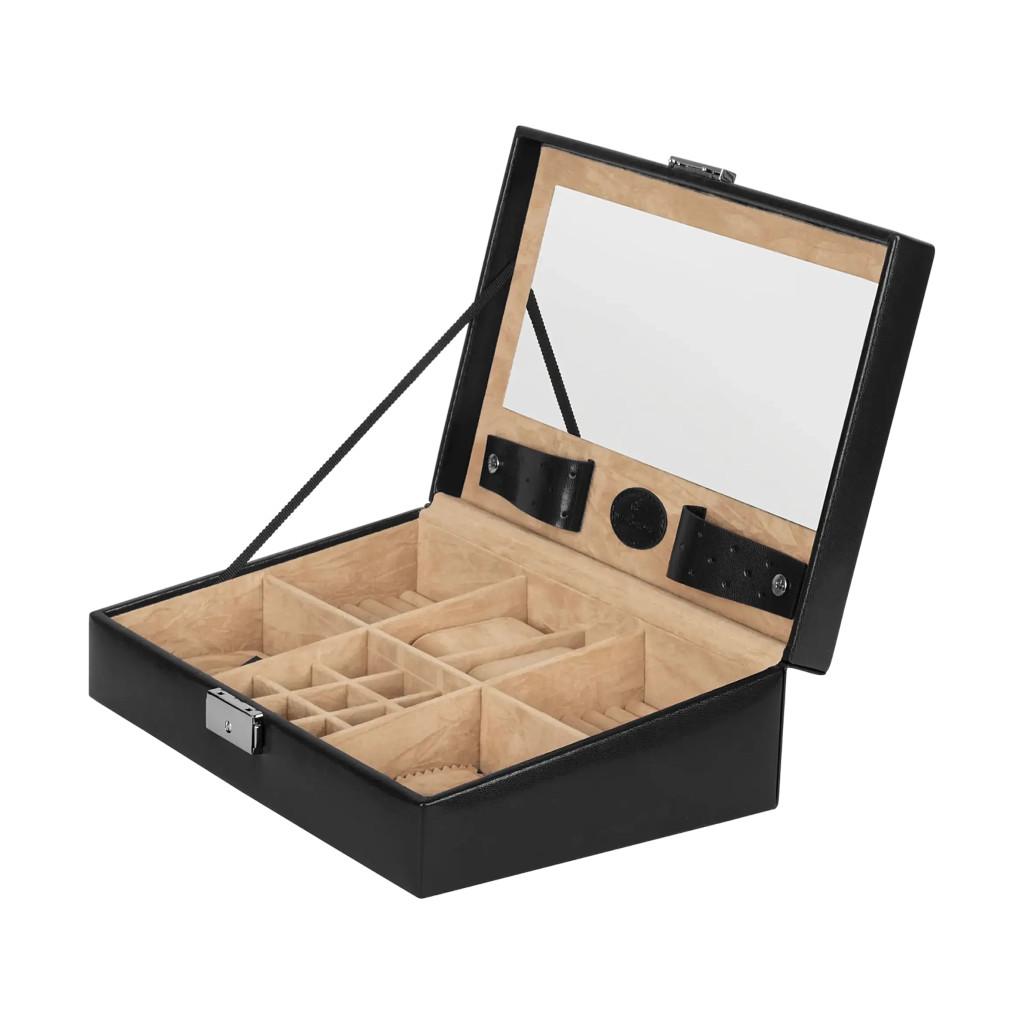 A belső elrendezés gazdag és átgondolt: két gyűrűpárna, két óratartó rekesz és három tárolórekesz, köztük egy kilenc részre osztott, apró ékszerekhez ideális fiók biztosítja a rendszerezett tárolást. A fedél belső oldalán található nagyméretű tükör megkönnyíti a mindennapi használatot, a puha bélés pedig gondoskodik az ékszerek karcmentes védelméről.